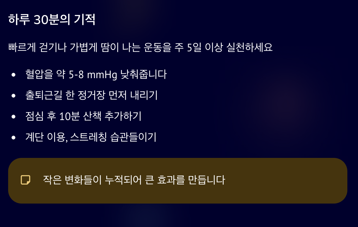 – 하루 30분 이상, 빠르게 걷기 또는 가볍게 땀이 나는 정도의 운동을 주 5일 이상 실천해보세요. 실제로 하루 30분 이상 활발한 유산소 운동은 혈압을 약 5 mmHg 가량 낮춰준다는 임상 지침이 있습니다.