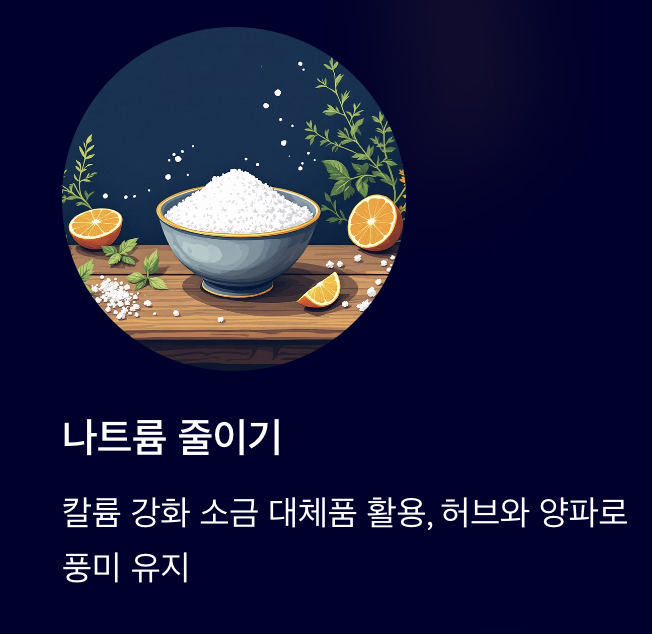 – 팁: 양념이나 국물 형태 음식이 많다면 소금 대신 허브·양파·마늘 등 향신료를 추가해서 풍미를 유지하면서 나트륨을 낮춰보세요.