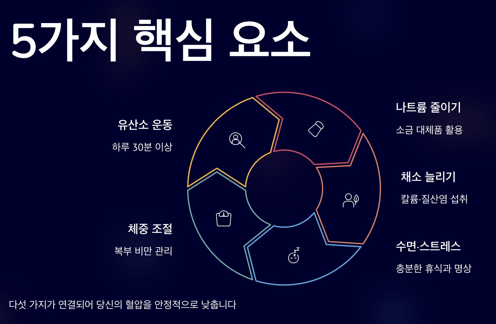 당신의 혈압을 내리기 위해선 유산소 운동 + 나트륨 줄이기 + 채소 늘리기 + 수면·스트레스 관리 + 체중 조절이 모두 연결되어야 합니다. 최신 연구는 소금 대체품과 채소 속 칼륨·질산염의 중요성을 강조합니다. 이 다섯 가지를 꾸준히 실행하면 ‘고혈압 낮추는 방법’이 단순한 목표가 아니라 내 몸의 변화로 이어집니다.