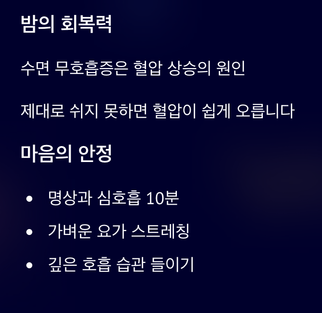 – 저 같은 경우, 한창 업무 과중이던 때 밤 11시 넘어 잠들고 아침에 혈압이 145/95가 나오는 날이 많았습니다. 이후 10분 스트레칭과 깊게 숨 들이쉬고 내쉬는 습관을 들이니 안정적인 수치로 바뀌었습니다.