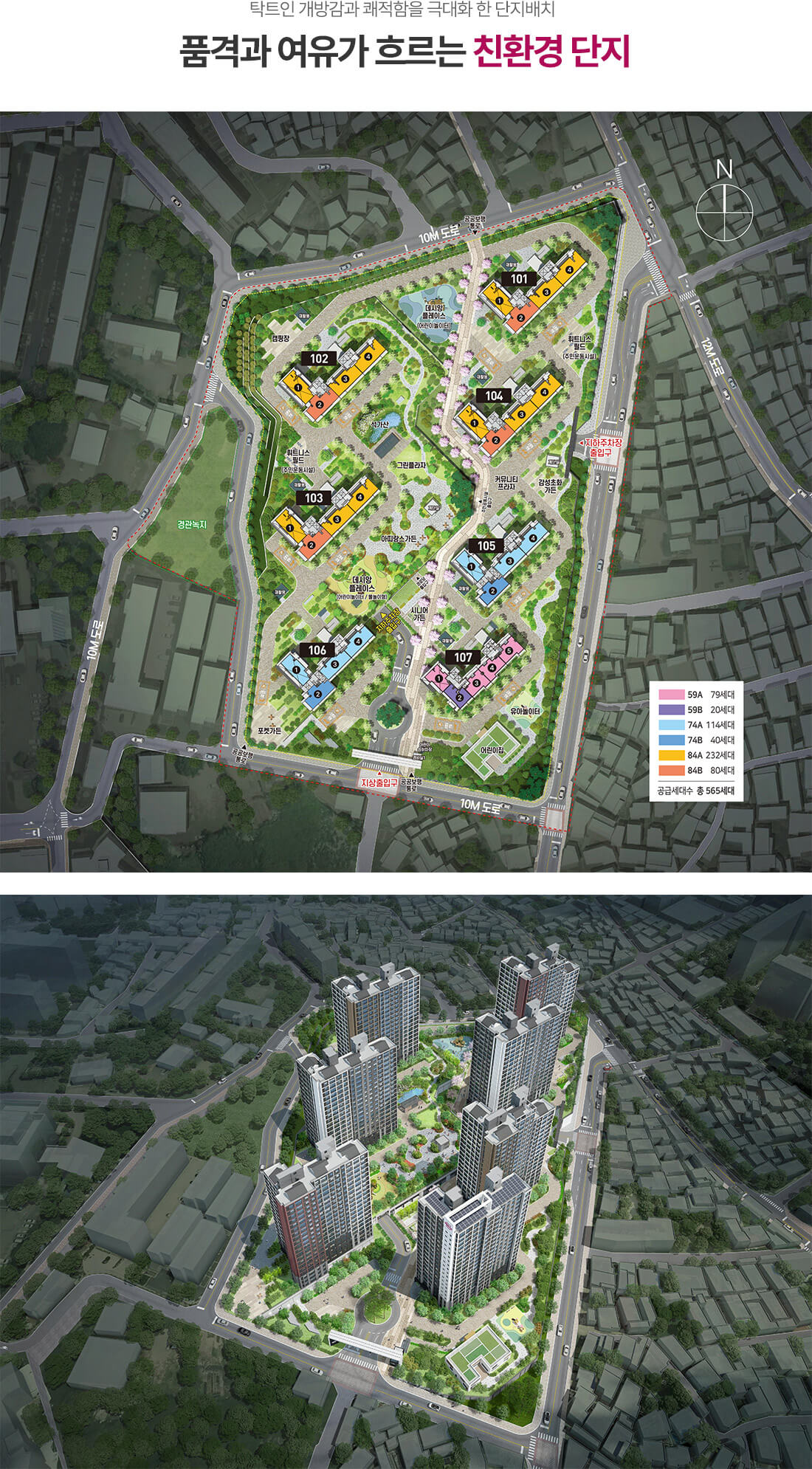 모든 세대가 남향 위주 배치로 풍부한 일조량을 확보했고, 넓은 동간 거리를 통해 개방감과 프라이버시를 동시에 확보했습니다.