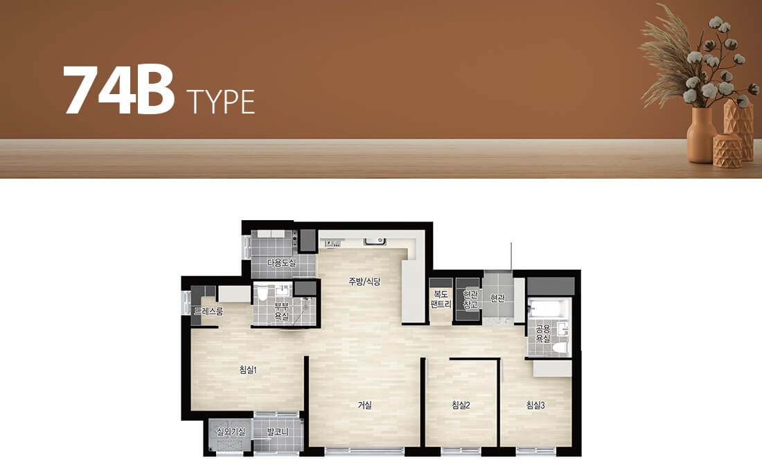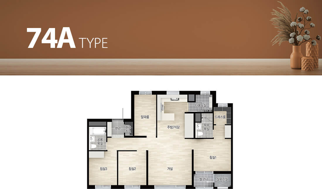 - 74㎡는 4bay 구조에 드레스룸과 팬트리가 있어 가족 단위 세대에 안성맞춤입니다.