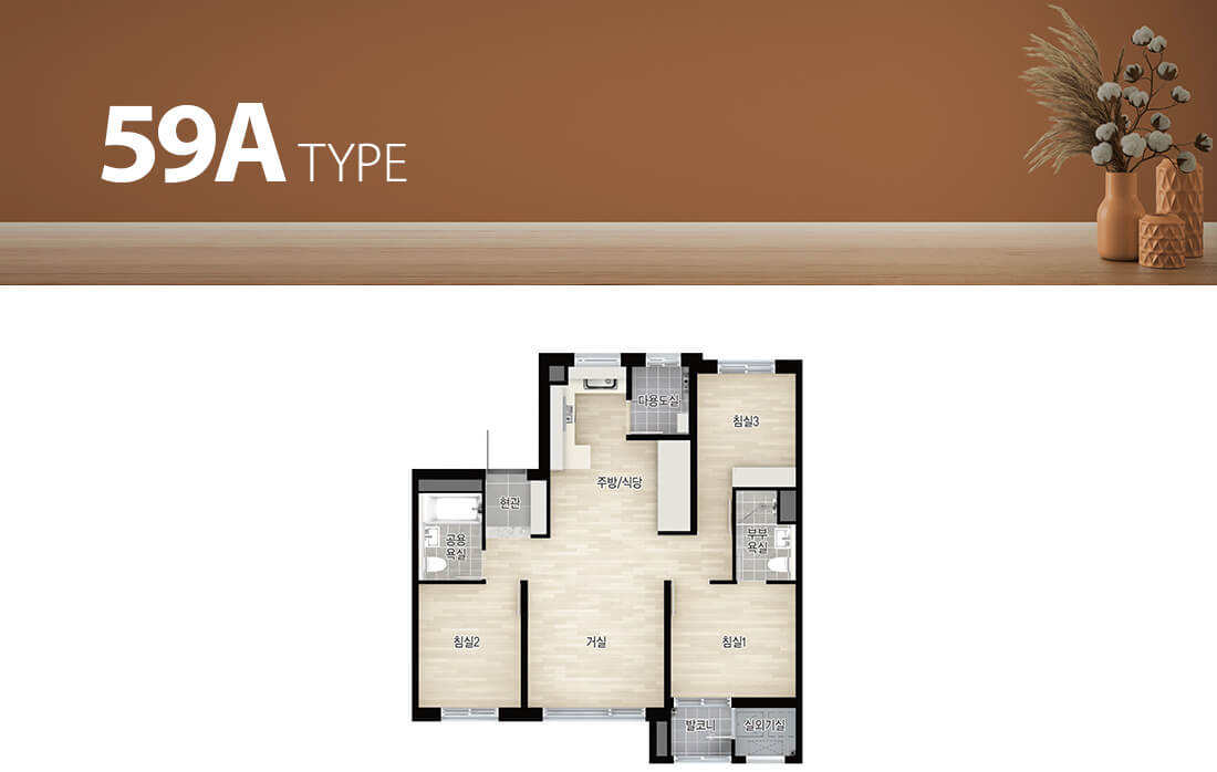 - 59㎡는 ㄱ자형 주방과 실용적인 다용도실을 갖춘 3bay 구조로 알뜰한 공간 활용이 가능합니다.