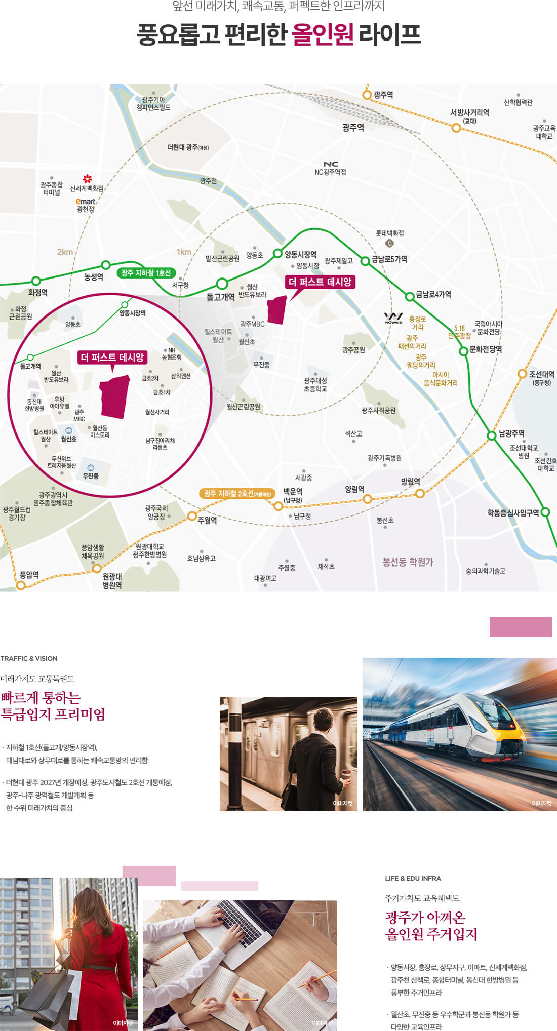 또한 신세계백화점, 롯데백화점, 이마트 같은 대형 쇼핑시설과 양동시장, 충장로 상권이 가까워 생활의 편리함이 탁월합니다.