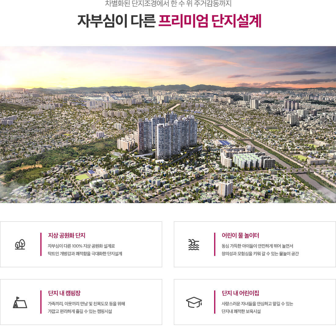 커뮤니티 시설 또한 다양하게 마련되어 있습니다. 피트니스센터, 실내 골프연습장, GX룸, 북카페, 독서실, 맘스클럽, 키즈플레이존 등 세대원 누구나 즐길 수 있는 공간이 조성되어 있으며, 녹지와 산책로, 아쿠아가든 등 테마형 조경이 단지를 공원처럼 감싸고 있습니다.
