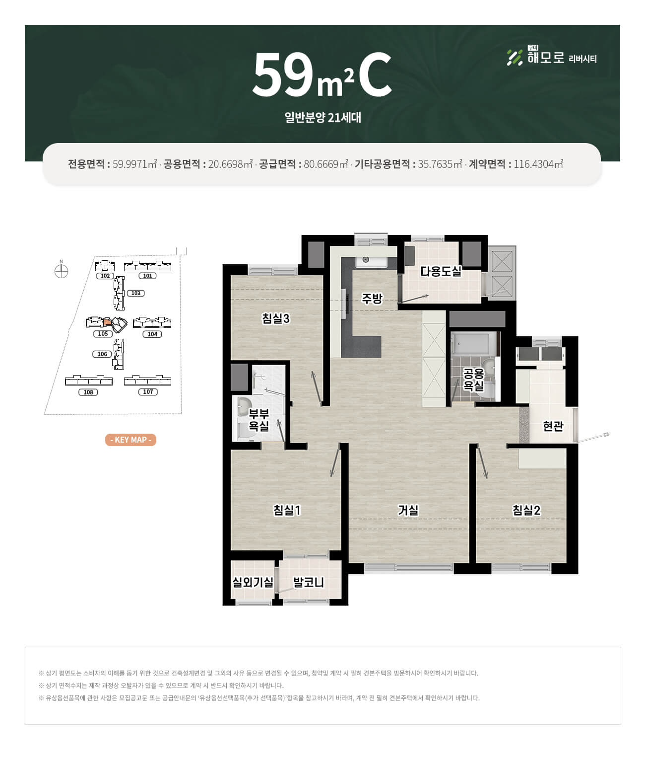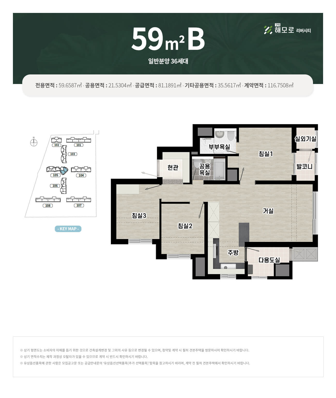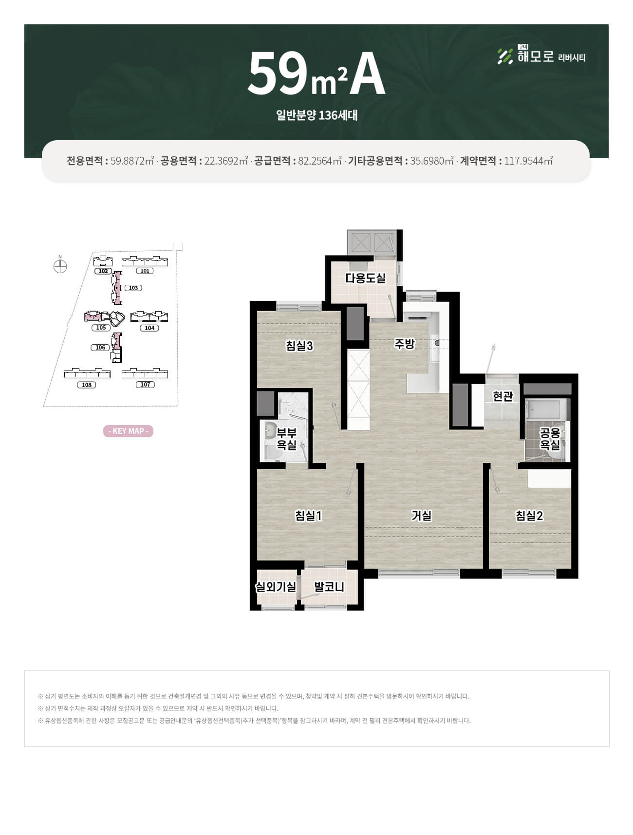 59㎡: A/B/C타입 – 3베이 판상형, ㄷ자 주방, 타워형 구성