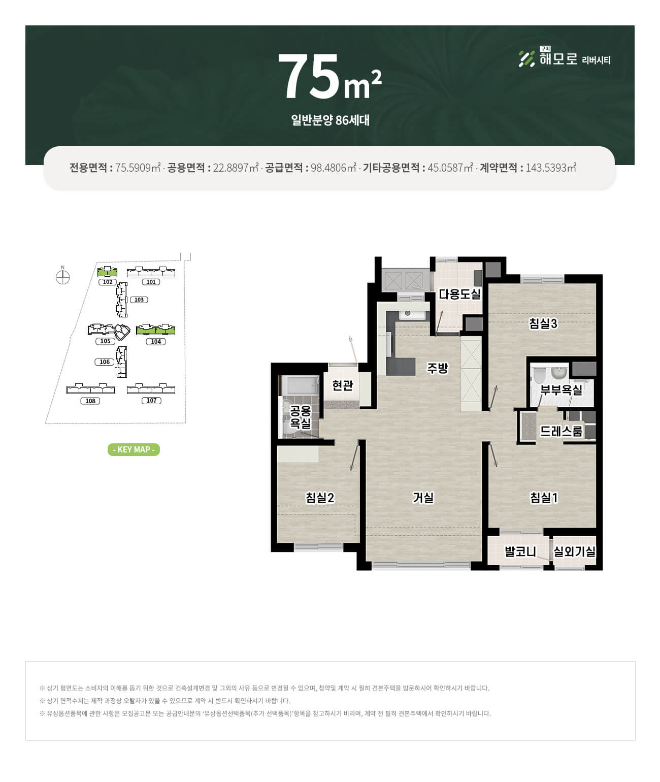 ‘구미 해모로 리버시티’는 실수요자의 니즈를 반영한 다양한 타입으로 구성되어 있습니다. 각 평면마다 실용성과 공간 활용도가 높아져, 전용면적 대비 높은 만족도를 기대할 수 있습니다.