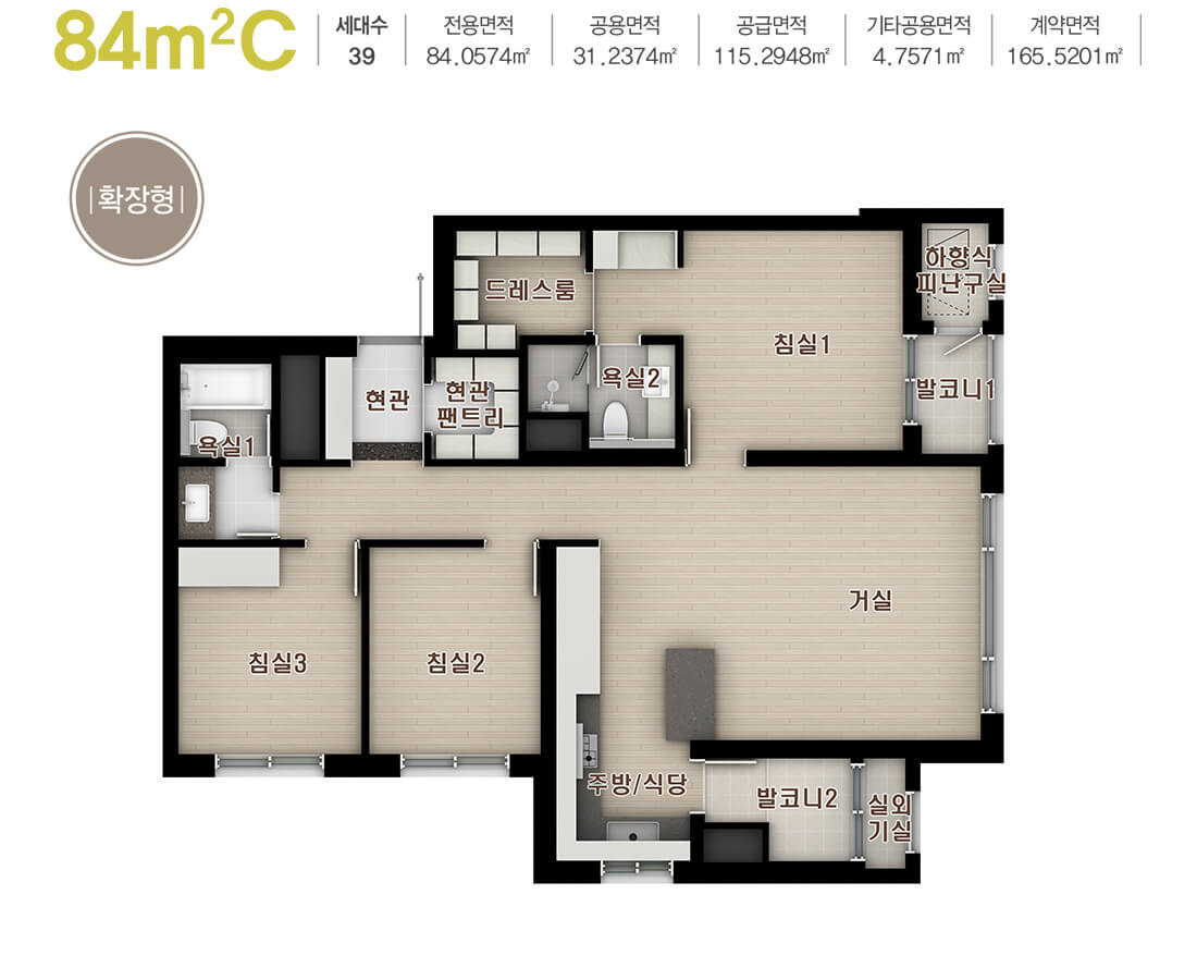 - 84C 타입은 코너형 설계로 개방감을 살리면서도 채광과 통풍을 모두 고려했습니다.