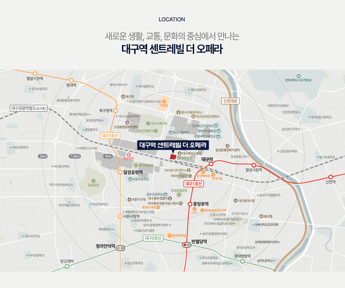 주거 선택의 첫 기준은 입지입니다. 대구역 센트레빌 더 오페라는 대구지하철 1호선 대구역까지 약 400m 거리의 역세권 입지로, 대중교통 접근성이 탁월합니다. 대구 전역을 30분 이내로 이동할 수 있으며, 향후 대경선 개발이 완료되면 더블 역세권으로 교통망이 한층 강화될 예정입니다.