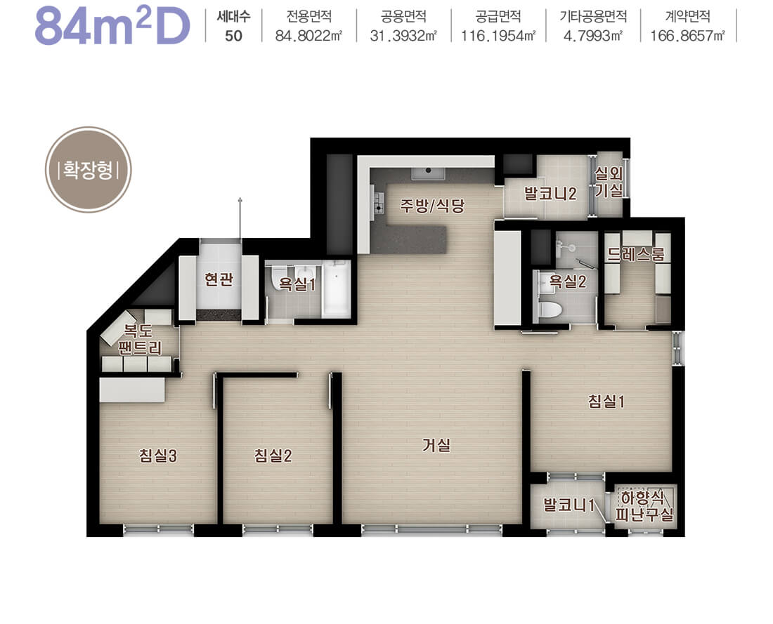 - 84D 타입은 와이드 팬트리와 4Bay 구조로 실용성과 개방감을 동시에 갖췄습니다.