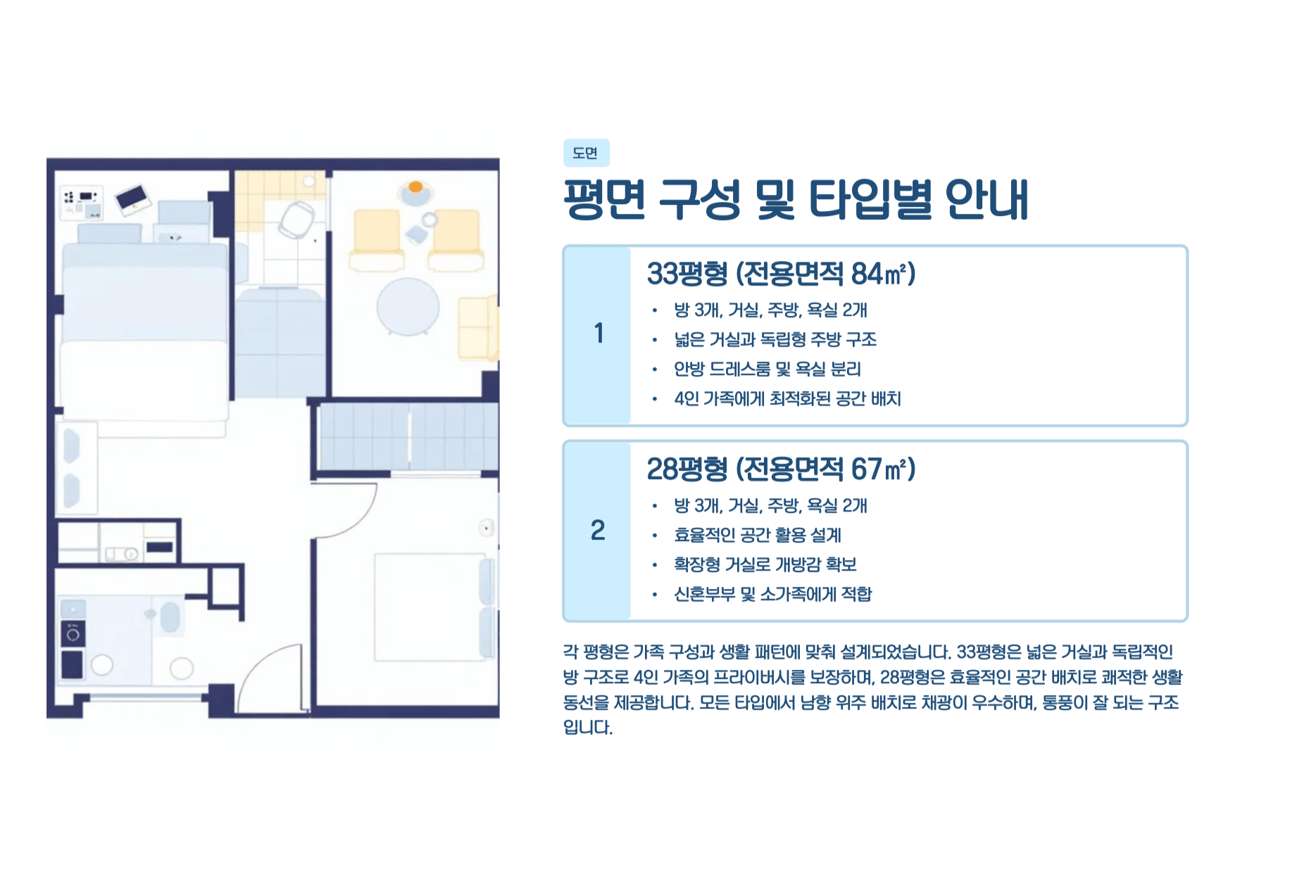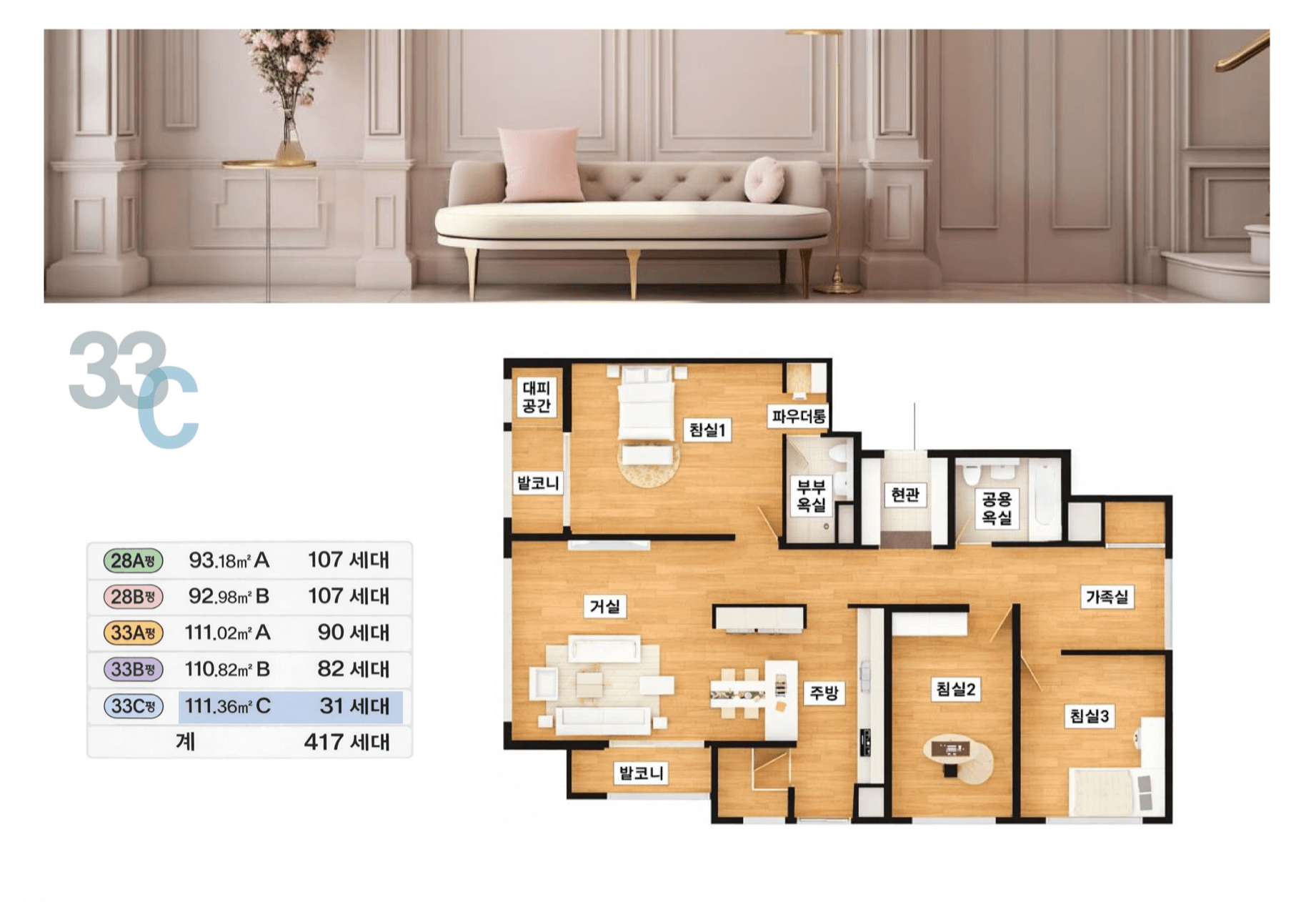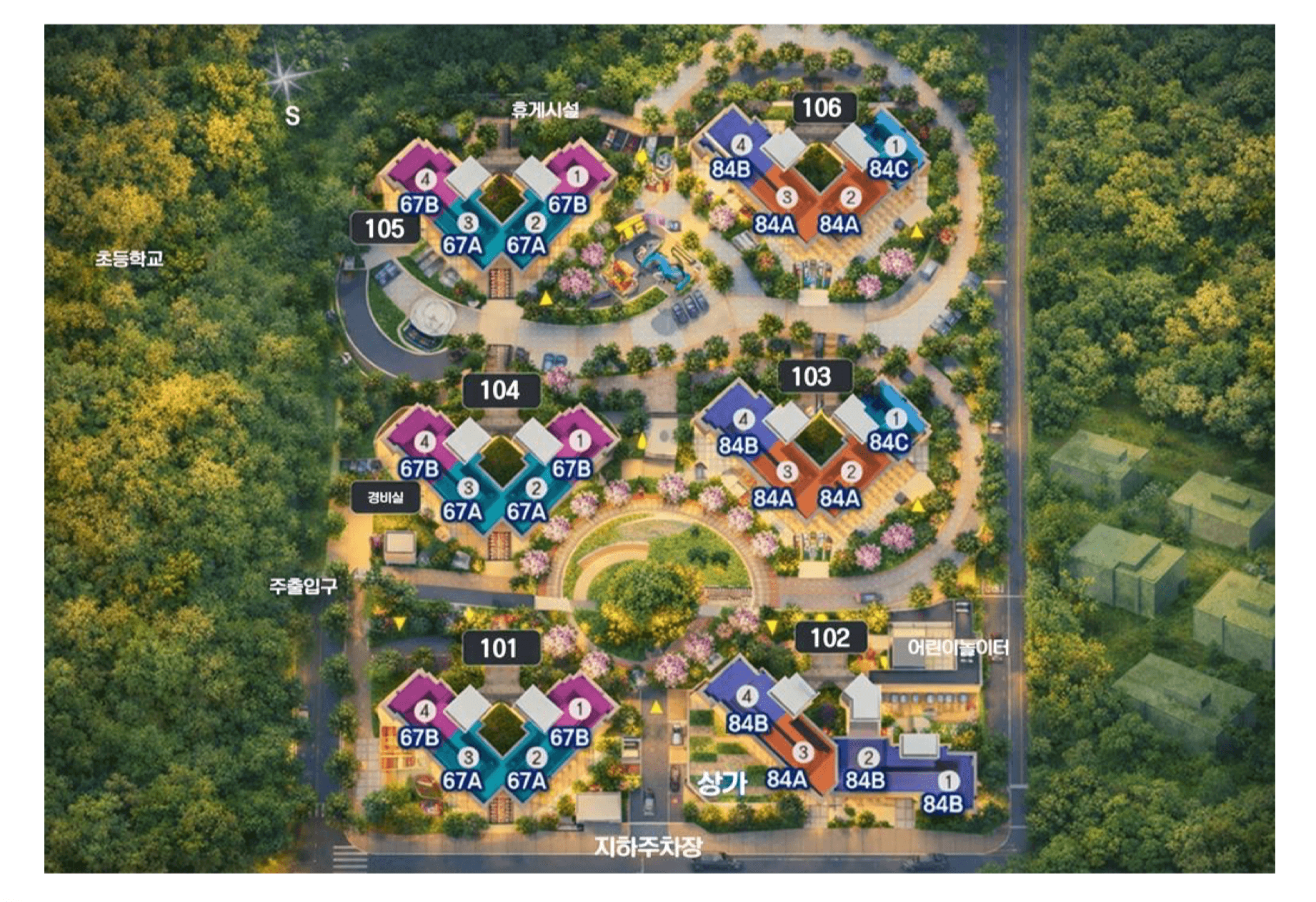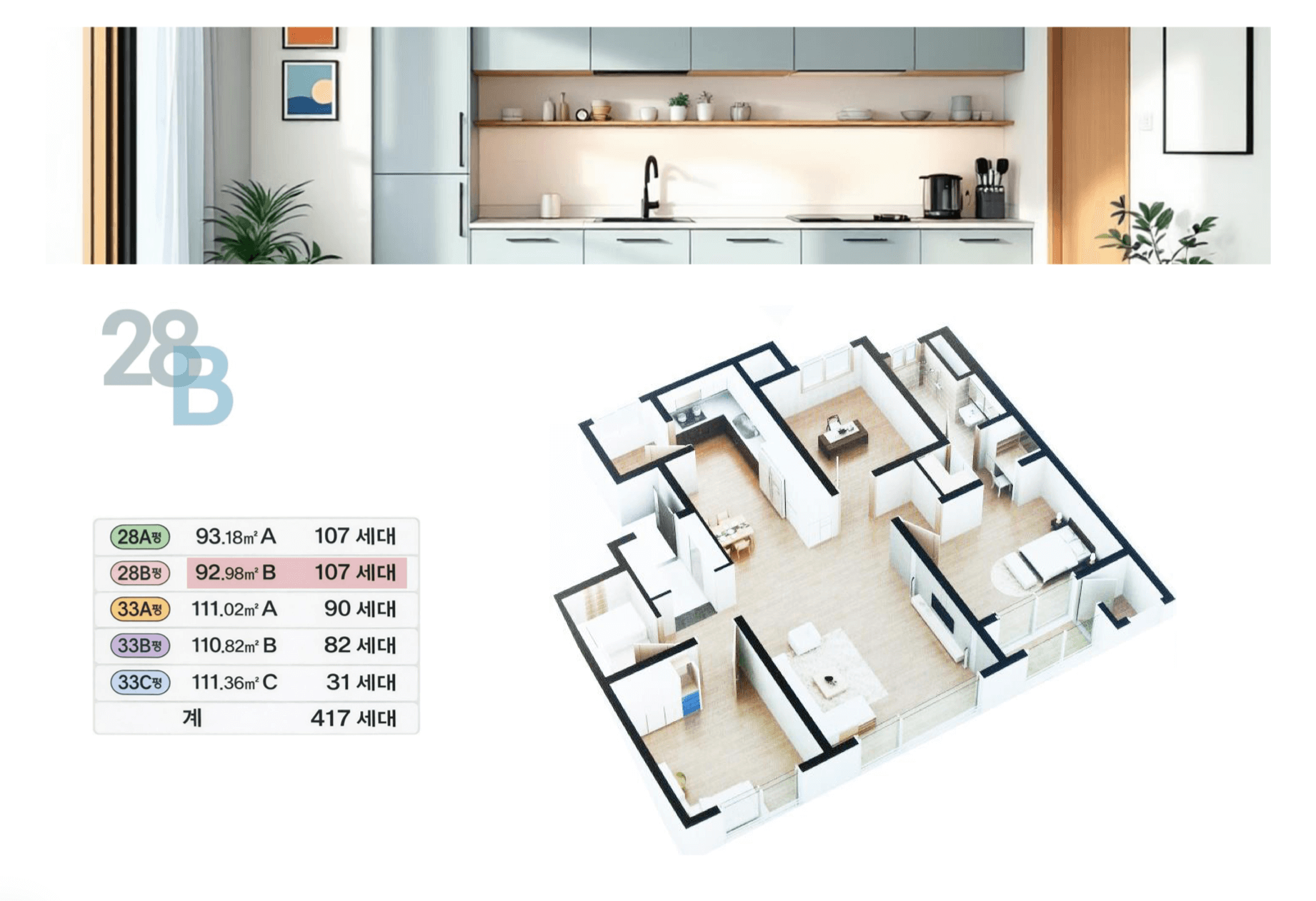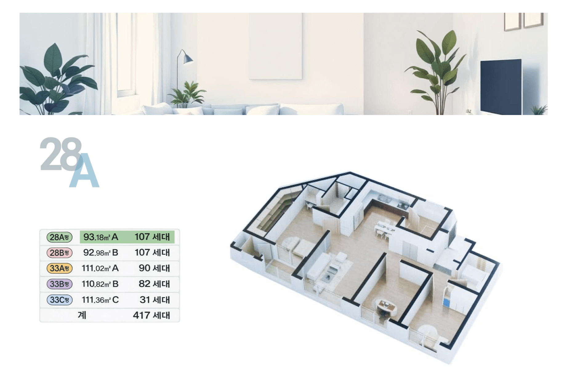 - 평형 구성: 28평형(67㎡) 및 33평형(84㎡/99㎡) 등 선호도 높은 중소형 평대 구성