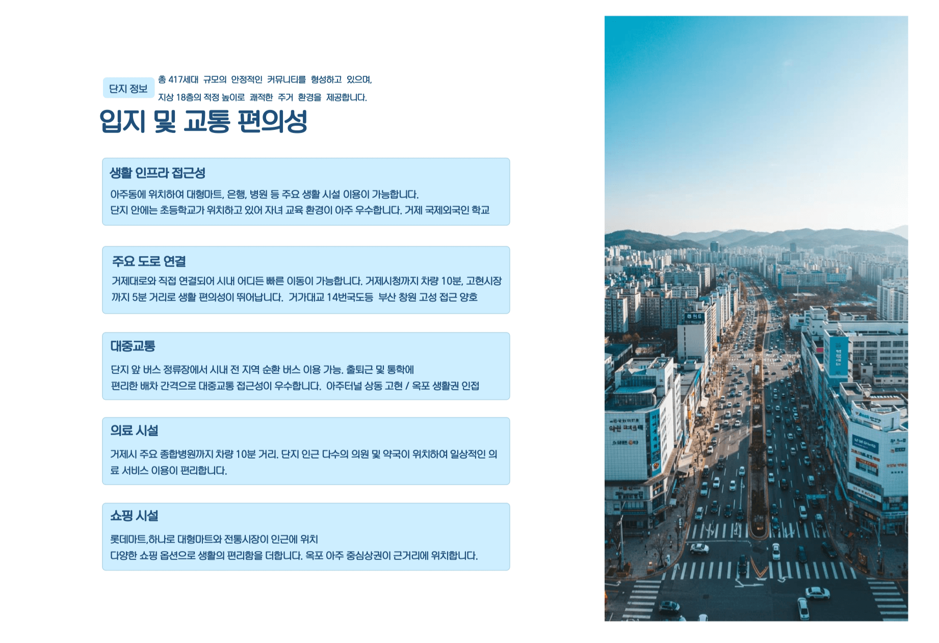 - 위치 및 규모: 경남 거제시 아주동 1396번지, 총 417세대 (7개동, 지상 18층)