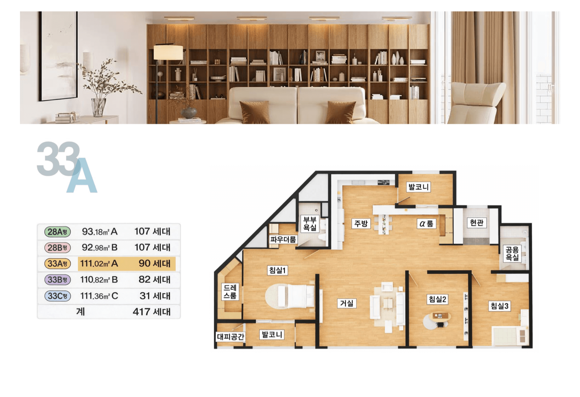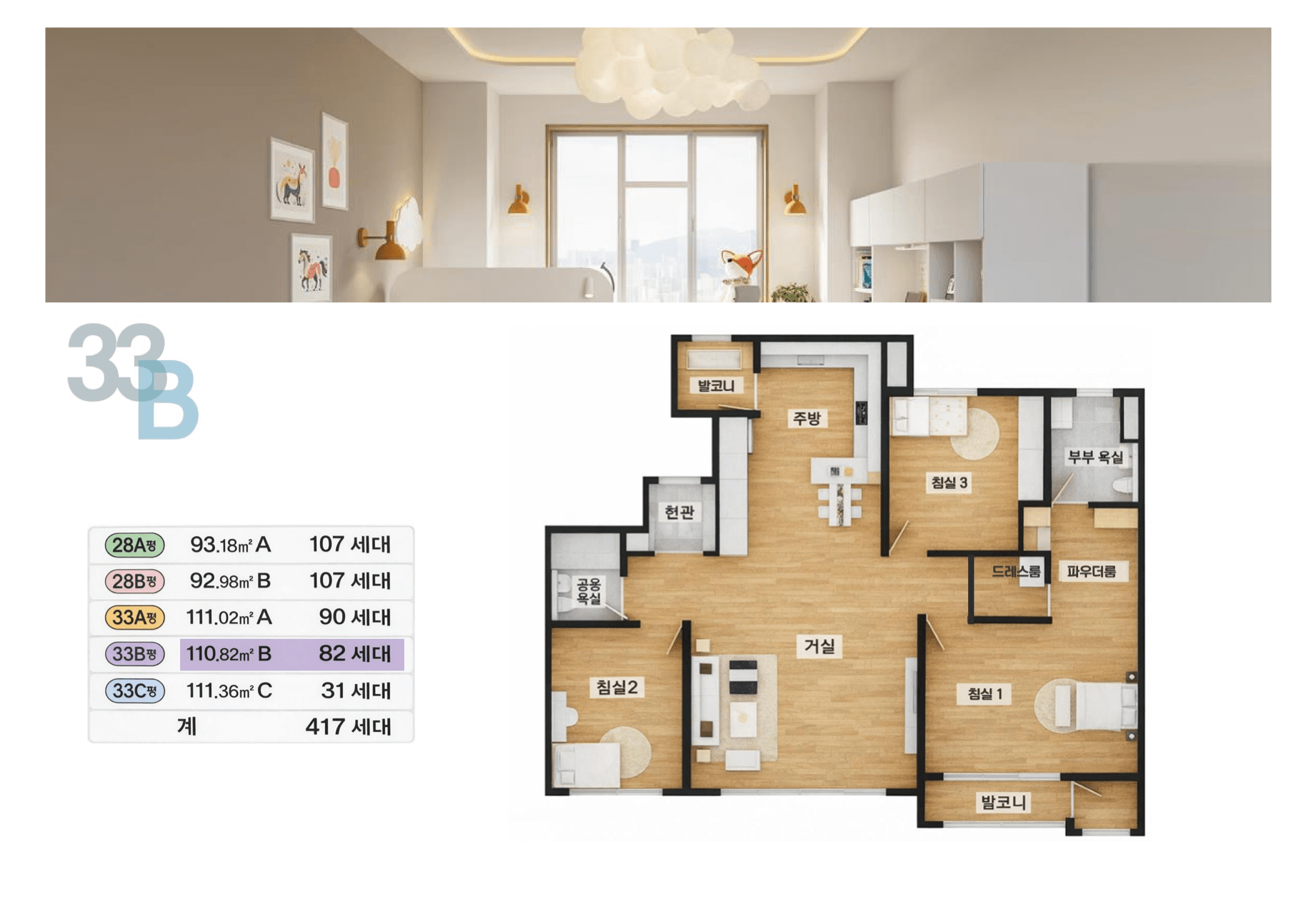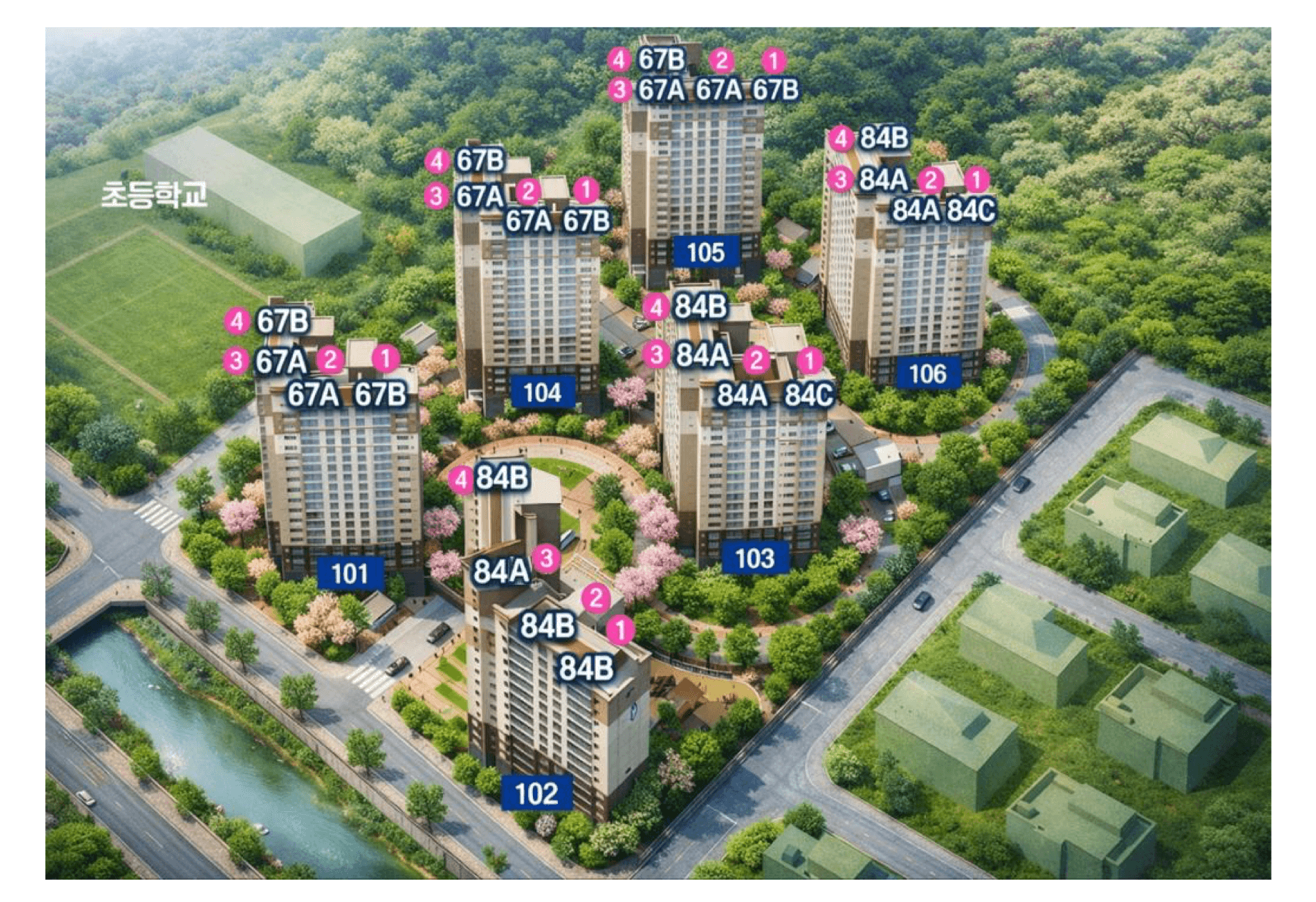 - 평형 구성: 28평형(67㎡) 및 33평형(84㎡/99㎡) 등 선호도 높은 중소형 평대 구성