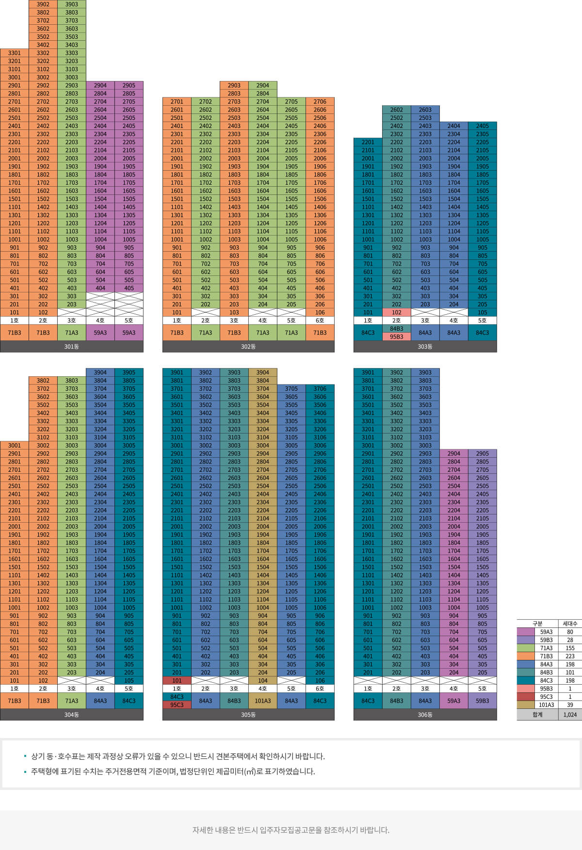- 71타입: 701세대 (ㄱ자형 주방, 아일랜드 식탁 적용)