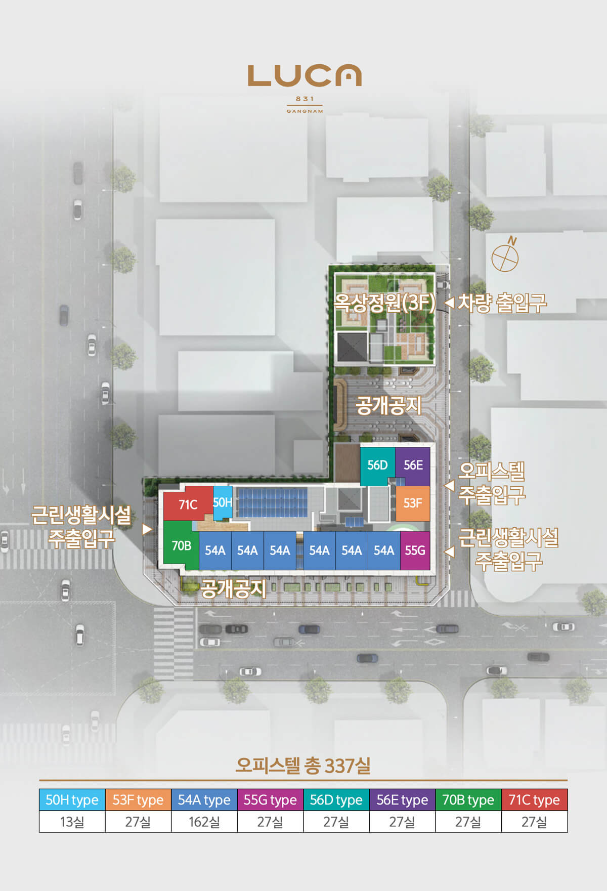 루카831의 오피스텔은 총 337개 호실로 구성되며, 주력 평형은 전용 54㎡입니다. 다양한 생활 패턴을 반영하여 50㎡~70㎡ 사이의 중소형 평형대로 제공되며, 무려 22개의 타입으로 세분화되어 선택의 폭이 넓습니다.