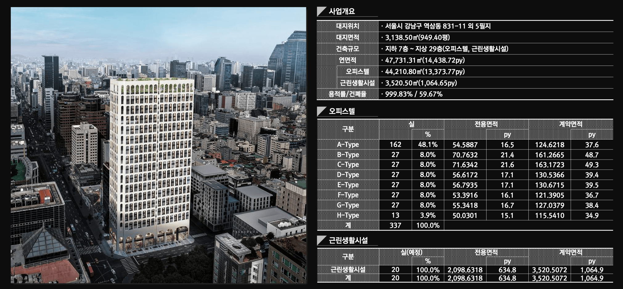 루카831은 서울 강남구 역삼동 831-11번지 일원에 자리하며, 지하 7층부터 지상 29층 규모로 총 337실이 들어섰습니다.