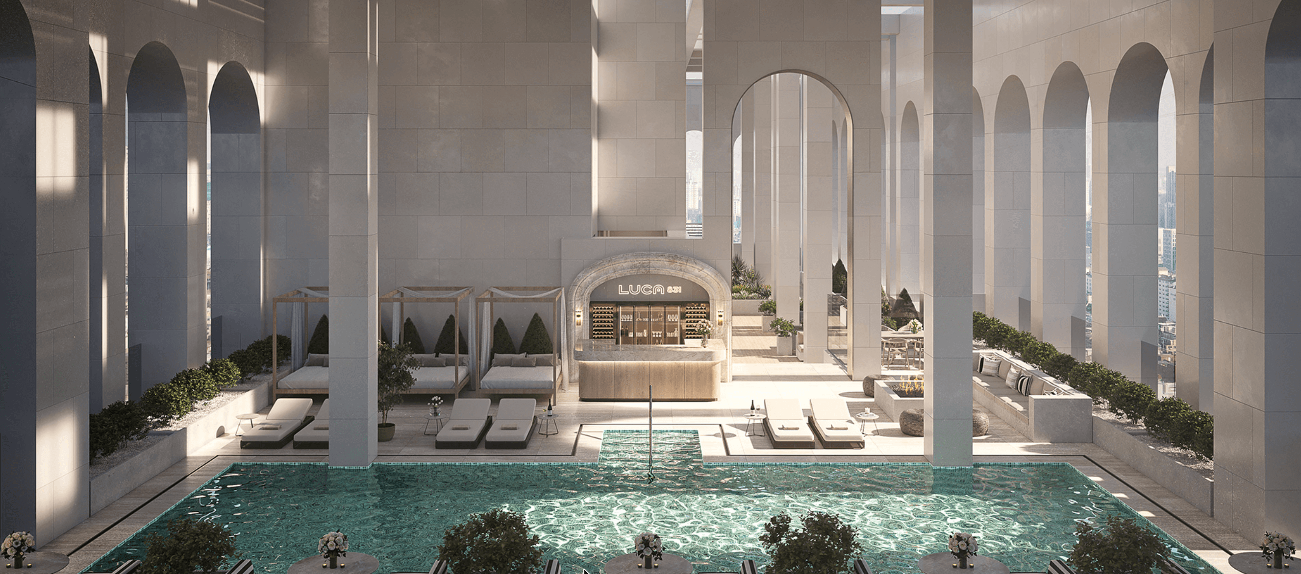 약 63평 규모의 루프탑 수영장은 강남의 스카이라인을 한눈에 조망할 수 있는 최고의 힐링 공간입니다.