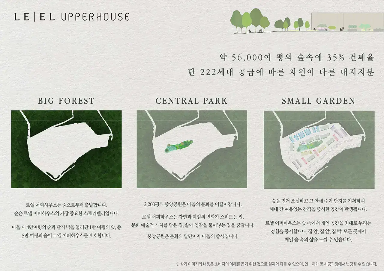 르엘 어퍼하우스는 숲을 단지의 중심에 두는 자연 우선 설계를 도입했습니다. 총 5만6,000평의 녹지 공간 중 4만 평은 단지 내부에 조성되며, BIG TREE PARK, RAIN GARDEN, 자작나무 군락지와 같은 특화된 숲 공간이 마련됩니다.