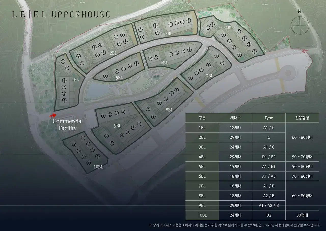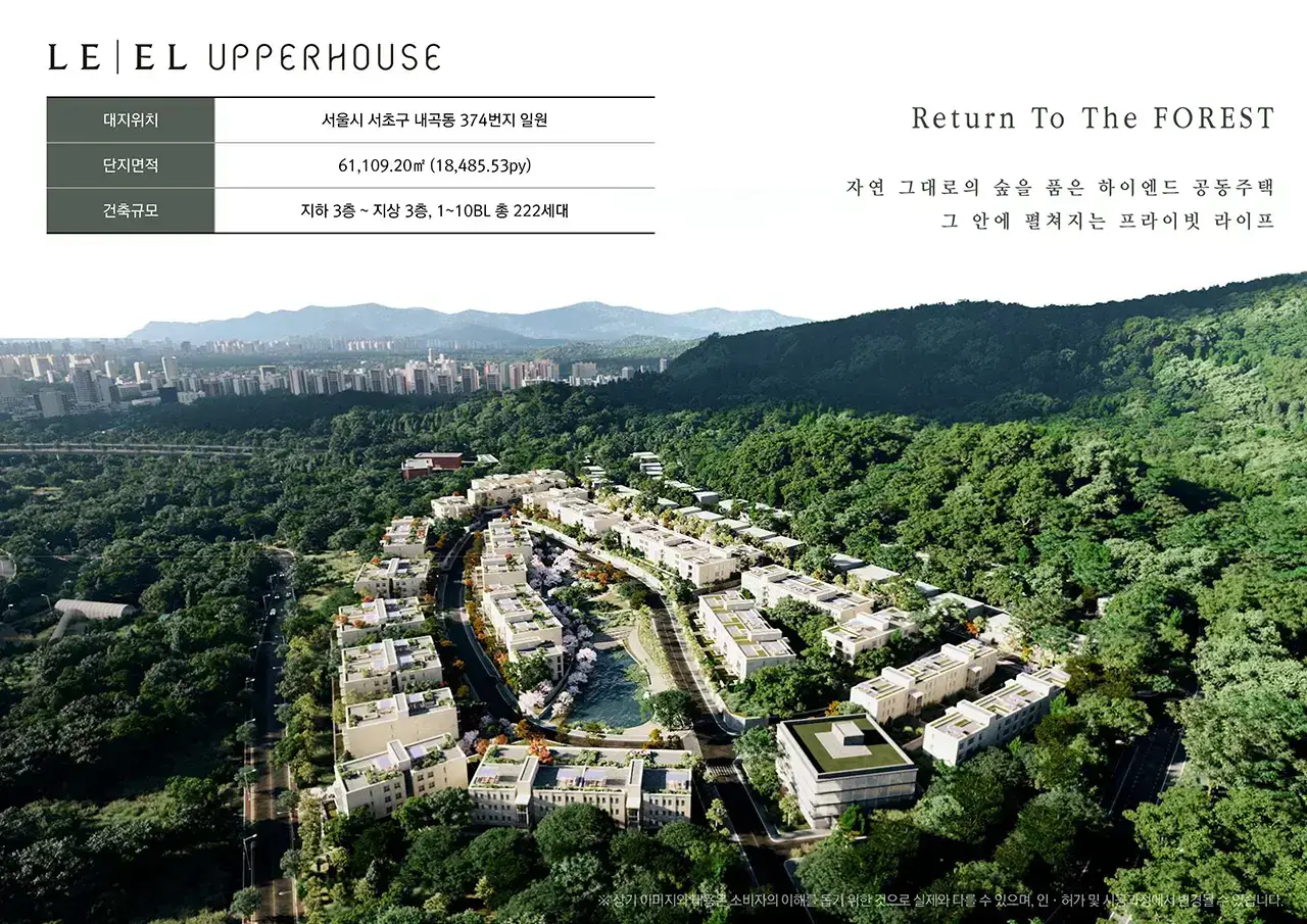 르엘 어퍼하우스는 서울시 서초구 내곡동 374번지 일대에 총면적 61,109㎡의 부지에 조성됩니다. 약 5만6,000평의 숲에 둘러싸인 이 단지는 지하 2층~지상 3층, 총 222세대 규모로 전용면적 119~274㎡의 대형 평형으로 구성되어 있습니다.