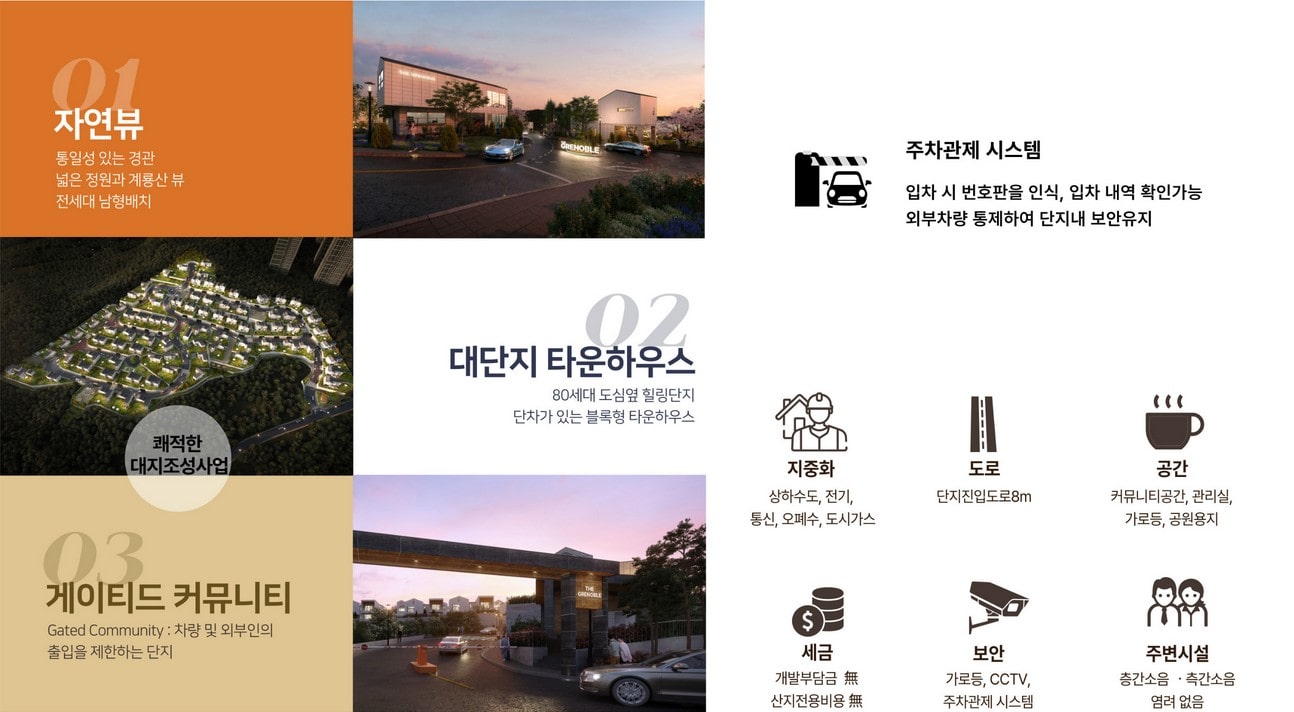 세종시 장군면 대교리에 위치한 더그르노블은 대단지 타운하우스로 조용하고 자연 친화적인 환경 속에서 풍요로운 삶을 즐길 수 있습니다.
