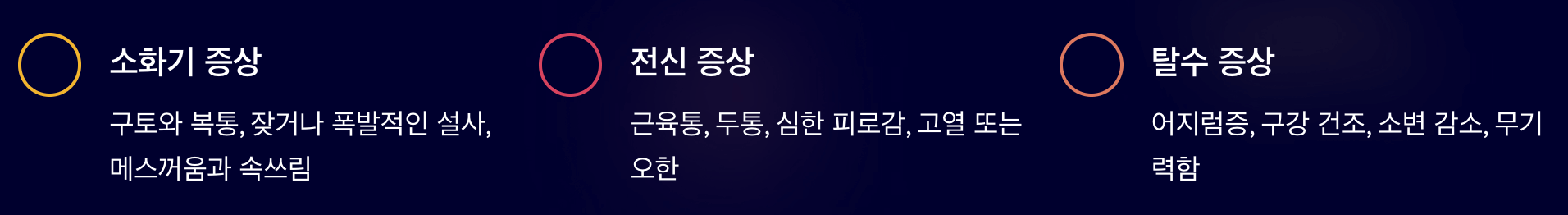- 물을 마셔도 증상이 나아지지 않음