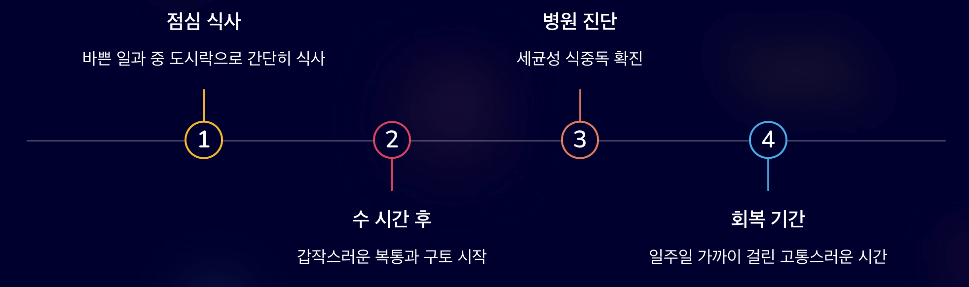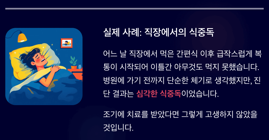 저 역시 어느 날 직장에서 먹은 간편식 이후 급작스럽게 복통이 시작되어 이틀간 아무것도 먹지 못했던 경험이 있습니다. 병원에 가기 전까지 단순한 체기로 생각했지만, 진단 결과는 심각한 식중독이었습니다. 조기에 치료를 받았다면 그렇게 고생하지 않았을 거란 생각이 들었습니다.