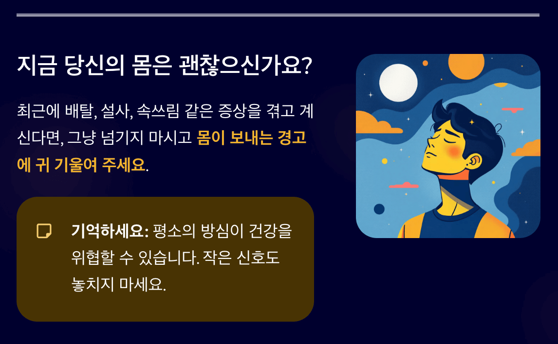 혹시 지금 이 글을 읽고 계신 분 중 최근에 배탈, 설사, 속쓰림 같은 증상을 겪고 계신다면, 그냥 넘기지 마시고 몸이 보내는 경고에 귀 기울여 주세요.