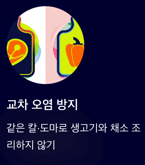 - 같은 칼·도마로 생고기와 채소 조리하지 않기