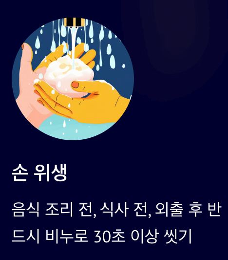 - 손은 음식 조리 전, 식사 전, 외출 후 반드시 비누로 30초 이상 씻기