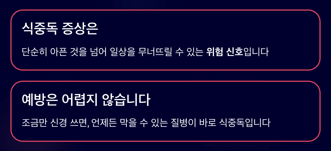 이처럼 식중독 증상은 단순한 소화 장애와는 다르게 전신 증상으로 이어지기 때문에 즉각적인 조치가 필요합니다.