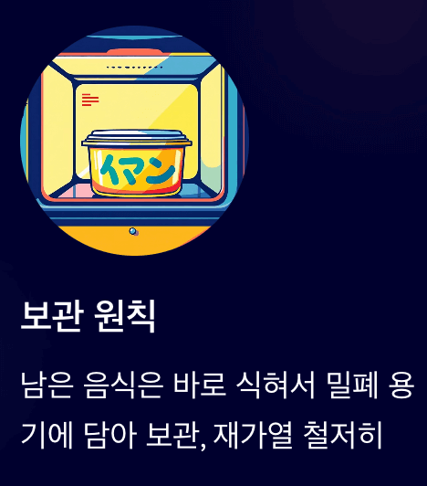 - 남은 음식은 바로 식혀서 밀폐 용기에 담아 보관, 재가열 철저히