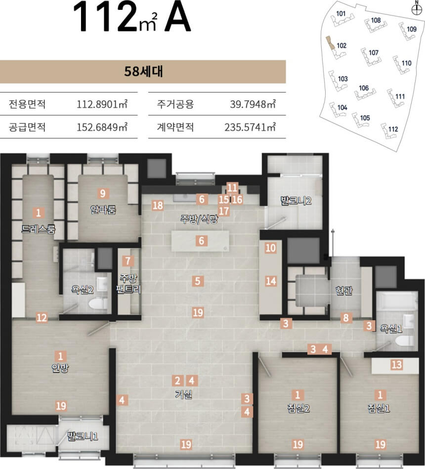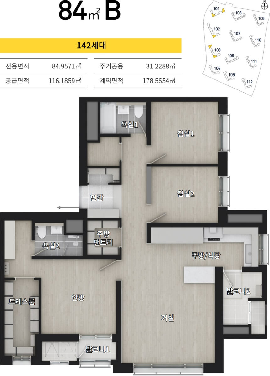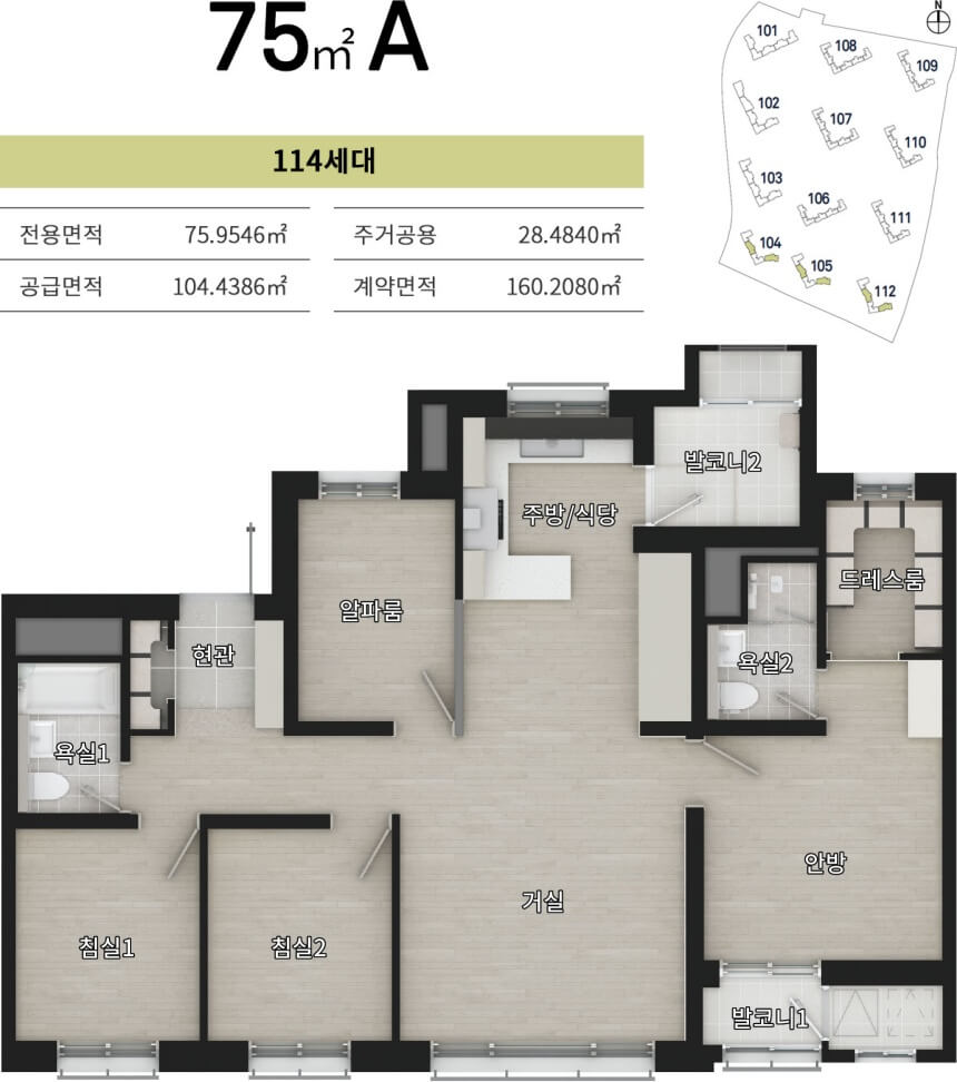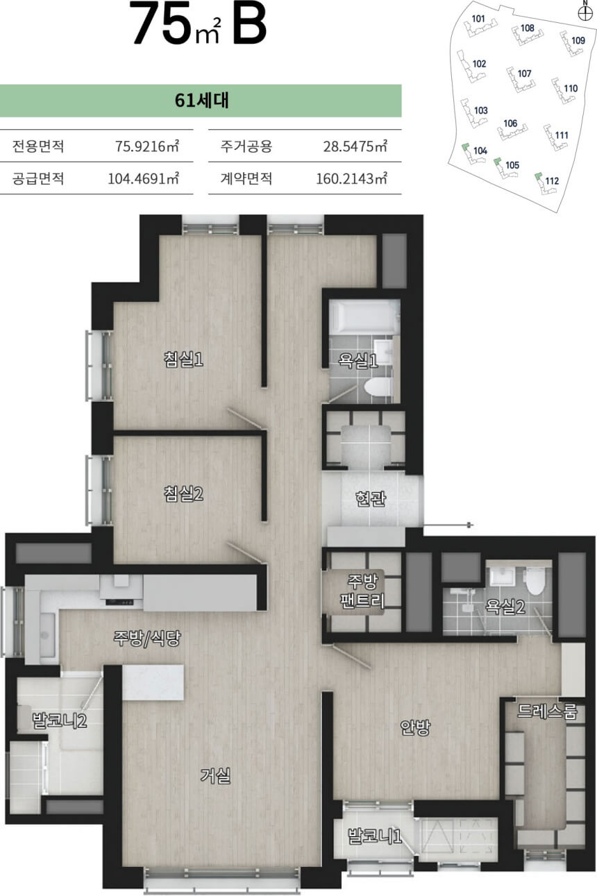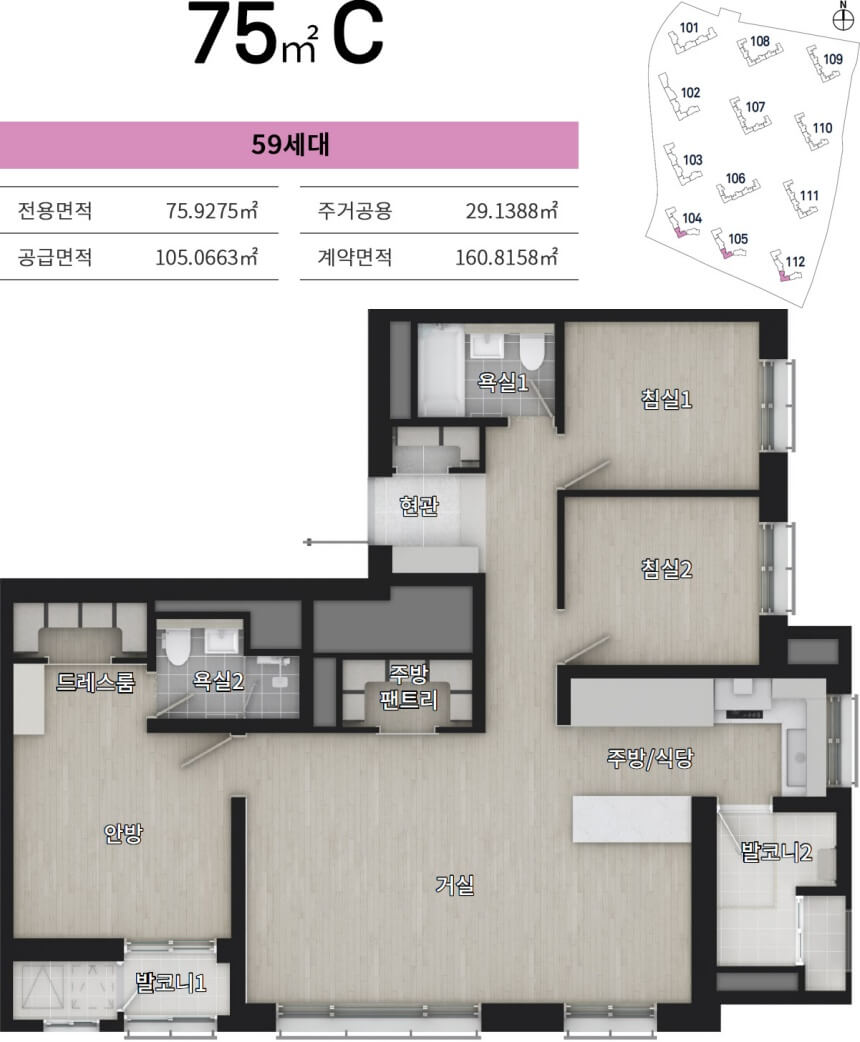 신분평 더웨이시티 제일풍경채는 전용면적 59㎡, 75㎡, 84㎡, 112㎡까지 네 가지 타입으로 구성되어 있습니다. 특히 59형은 전체 세대 중 54.77%를 차지하며 임대형으로만 공급됩니다. 소형 평형대지만 세심한 공간 활용으로 실수요자에게 높은 만족도를 제공합니다.