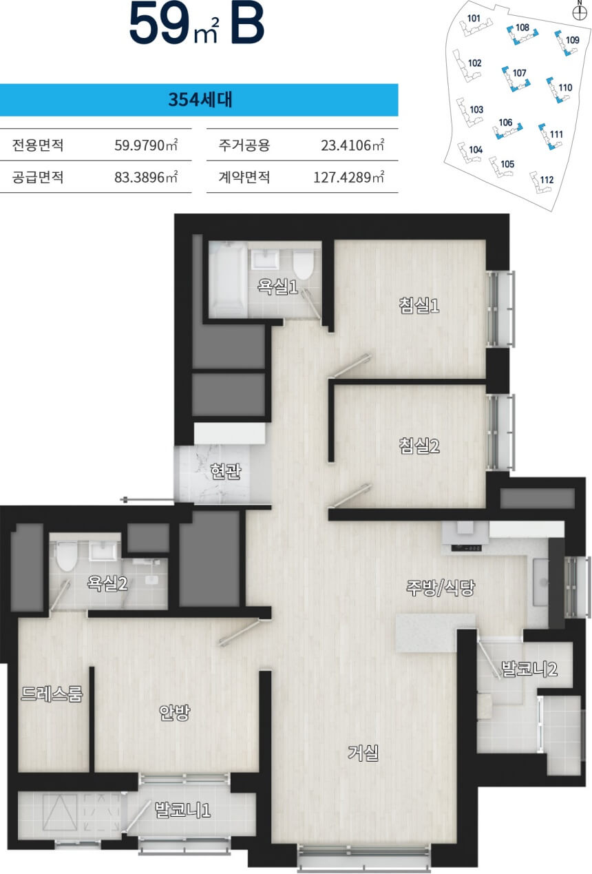 59B형은 타워형 구조로 개방감이 돋보이며, LDK(거실·주방·식당 통합) 형태를 통해 넓고 자유로운 생활 동선을 확보했습니다.