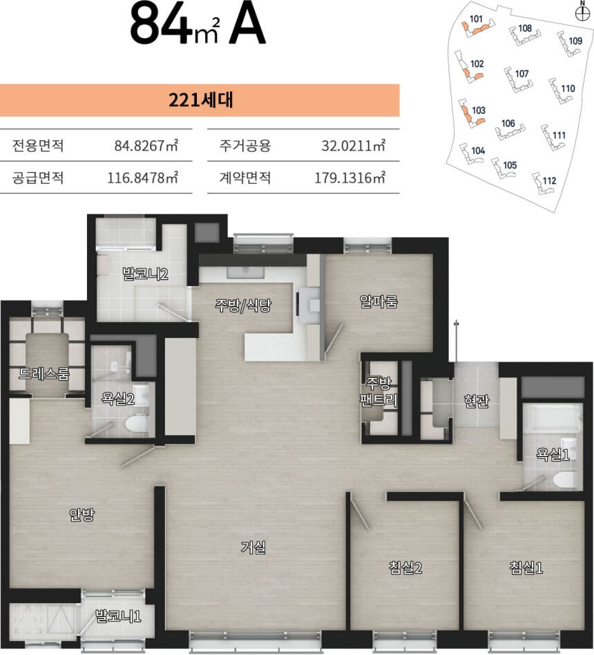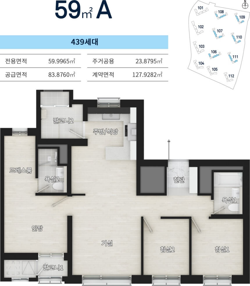59A형은 4Bay 판상형 구조로, 거실과 주방을 중심으로 맞통풍 구조가 적용되어 환기와 채광이 우수합니다. ㄷ자형 주방 설계로 조리 동선이 효율적이며, 부엌 옆 다용도실과 안방 드레스룸, 침실 붙박이장 등 수납공간이 체계적으로 배치되었습니다.