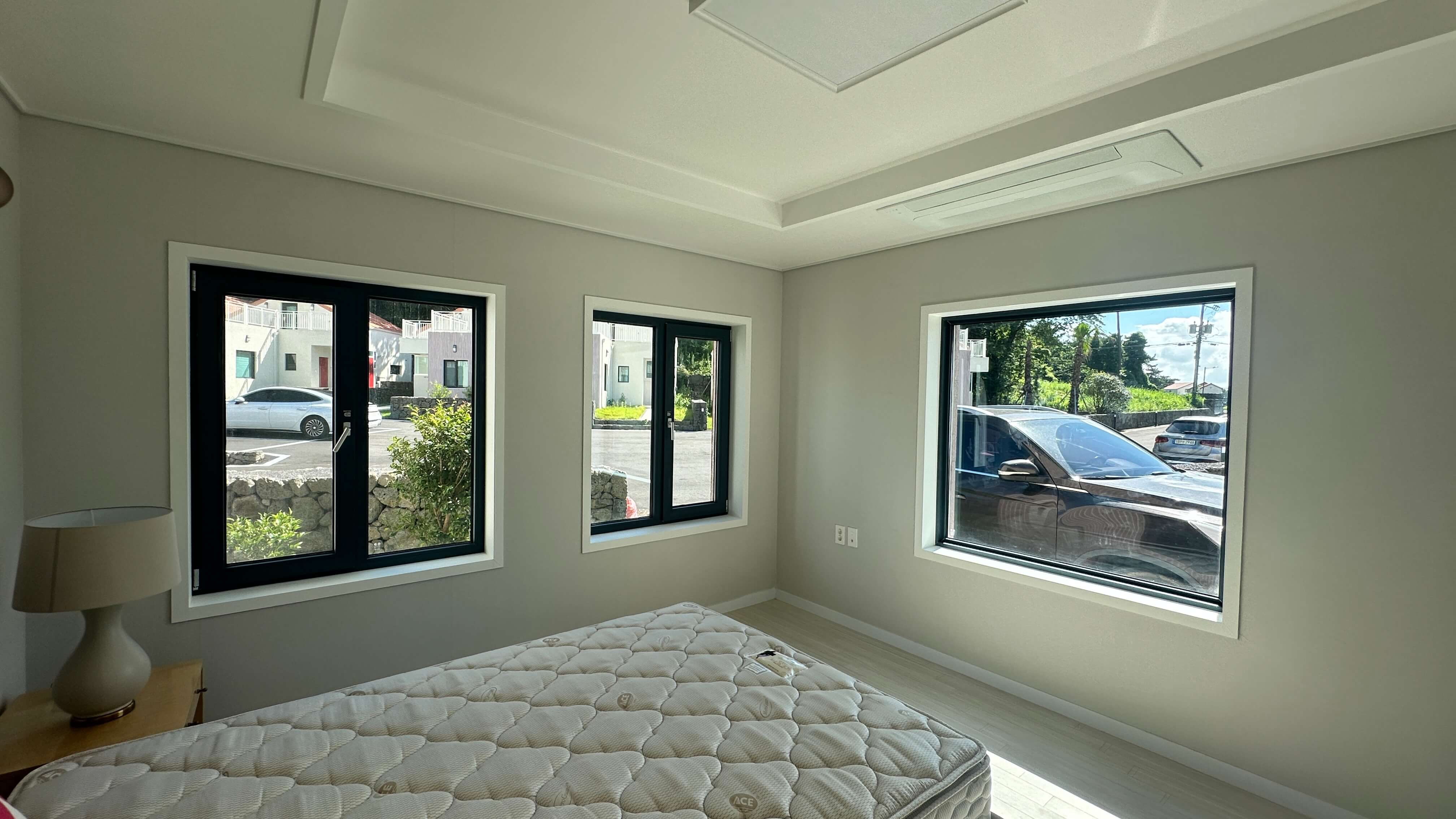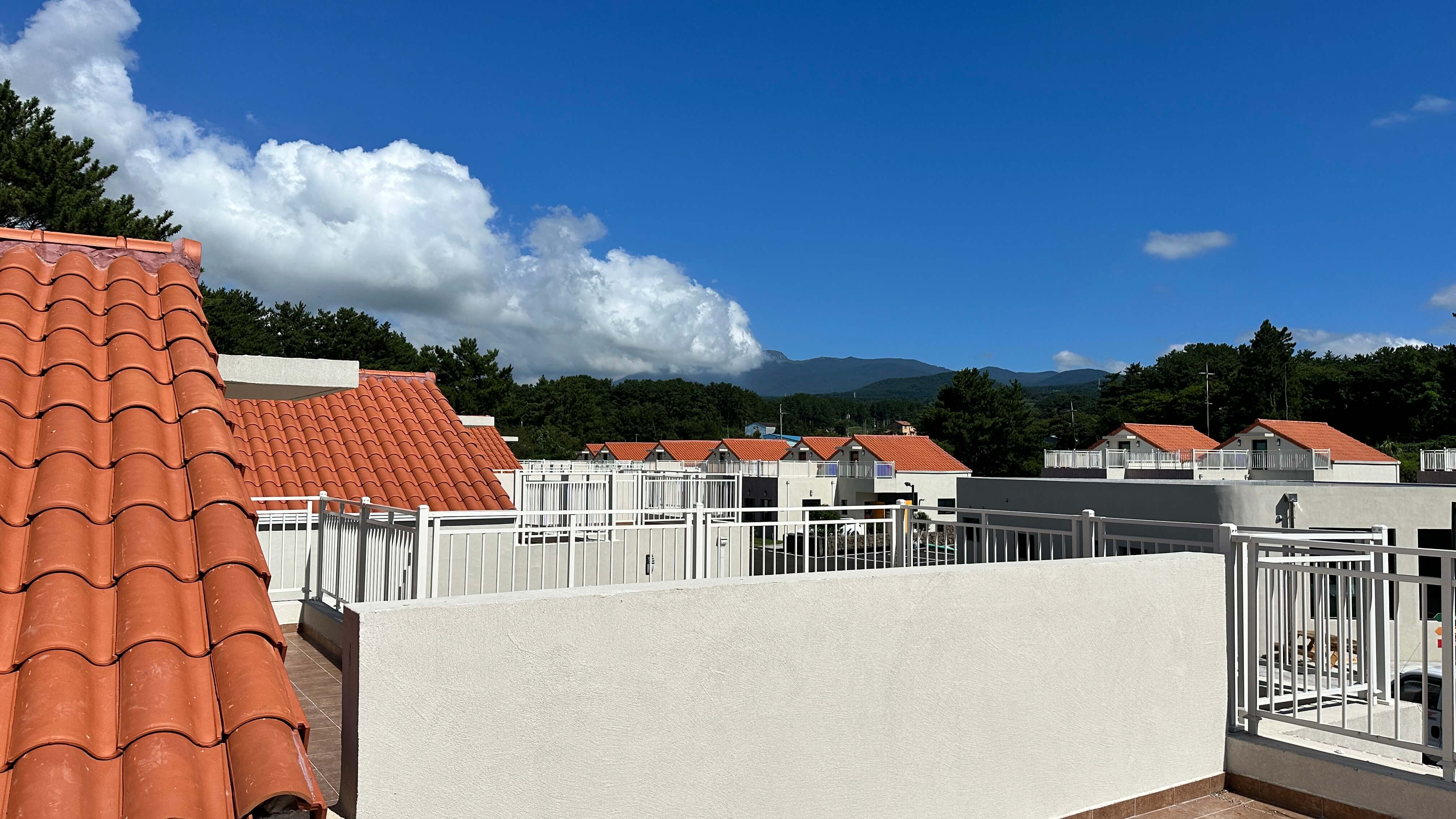 2층 테라스에서는 한라산을 조망할 수 있어 도시 생활의 답답함을 해소하며, 진정한 휴식을 제공합니다. 단지 내에는 약 12m의 큰 도로가 가로지르며, 전체 단지가 3면으로 작은 산들로 둘러싸여 조용하고 쾌적한 환경을 제공합니다.