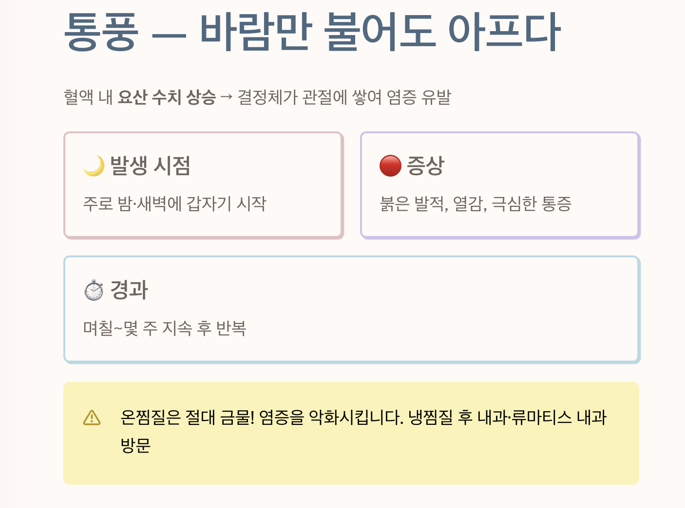 - 주요 증상: 주로 밤이나 새벽에 갑자기 발생하며, 관절 부위가 붉게 변하고 열감이 느껴져요.