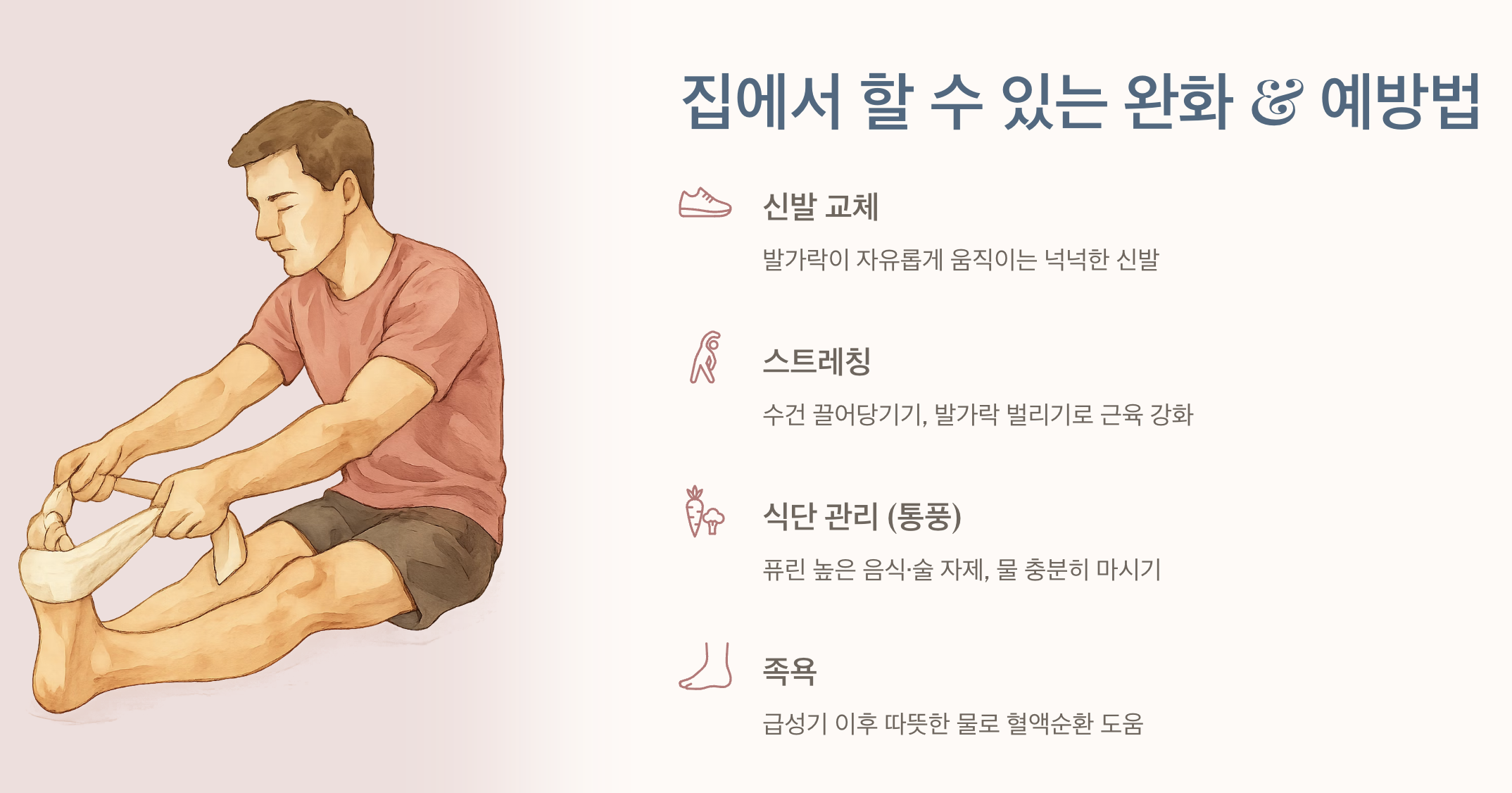 - 족욕: 통증이 심한 급성기가 지난 후라면 따뜻한 물로 족욕을 해 혈액순환을 돕는 것도 좋은 방법이에요.