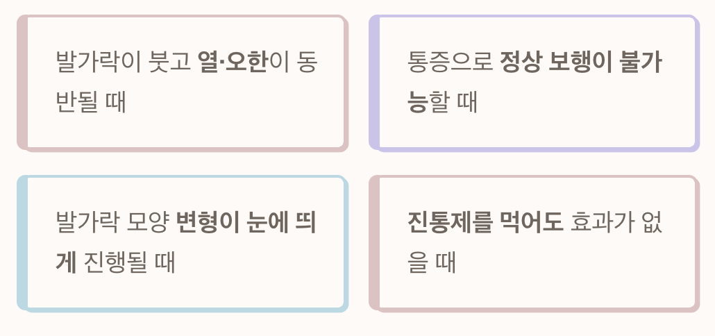 - 발가락이 빨갛게 붓고 열이 나며 오한이 동반될 때