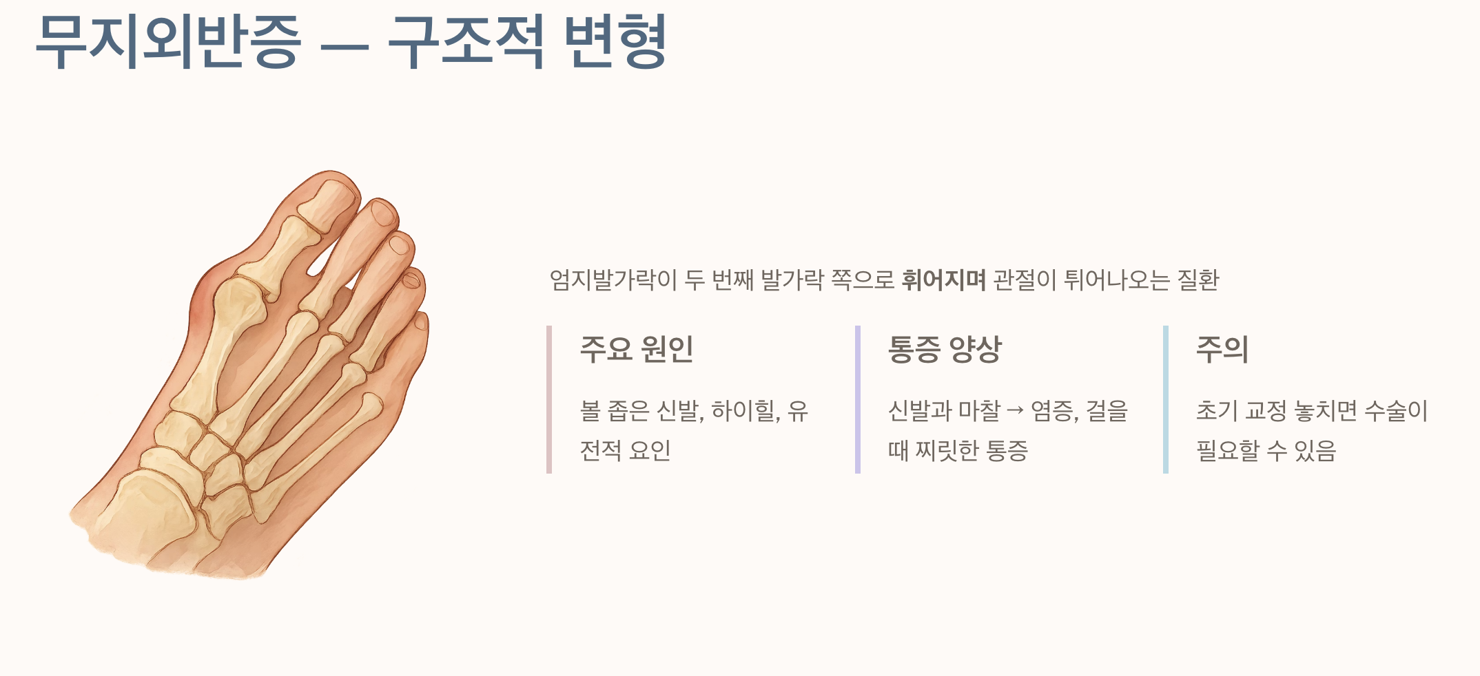 통풍이 '내과적인 문제'라면, 무지외반증은 '구조적인 문제'입니다. 엄지발가락이 두 번째 발가락 쪽으로 휘어지면서 관절 부위가 툭 튀어나오는 질환이죠.