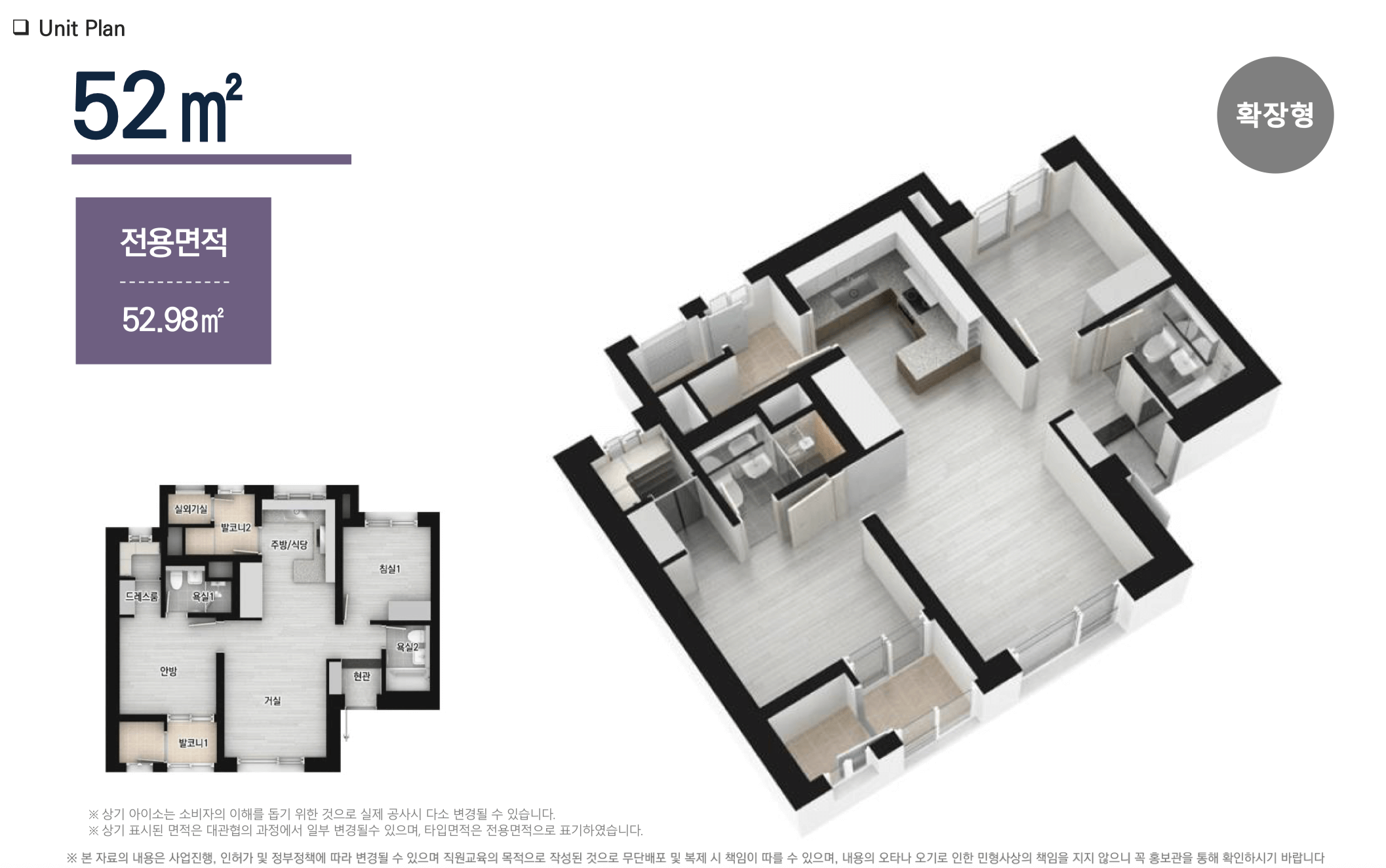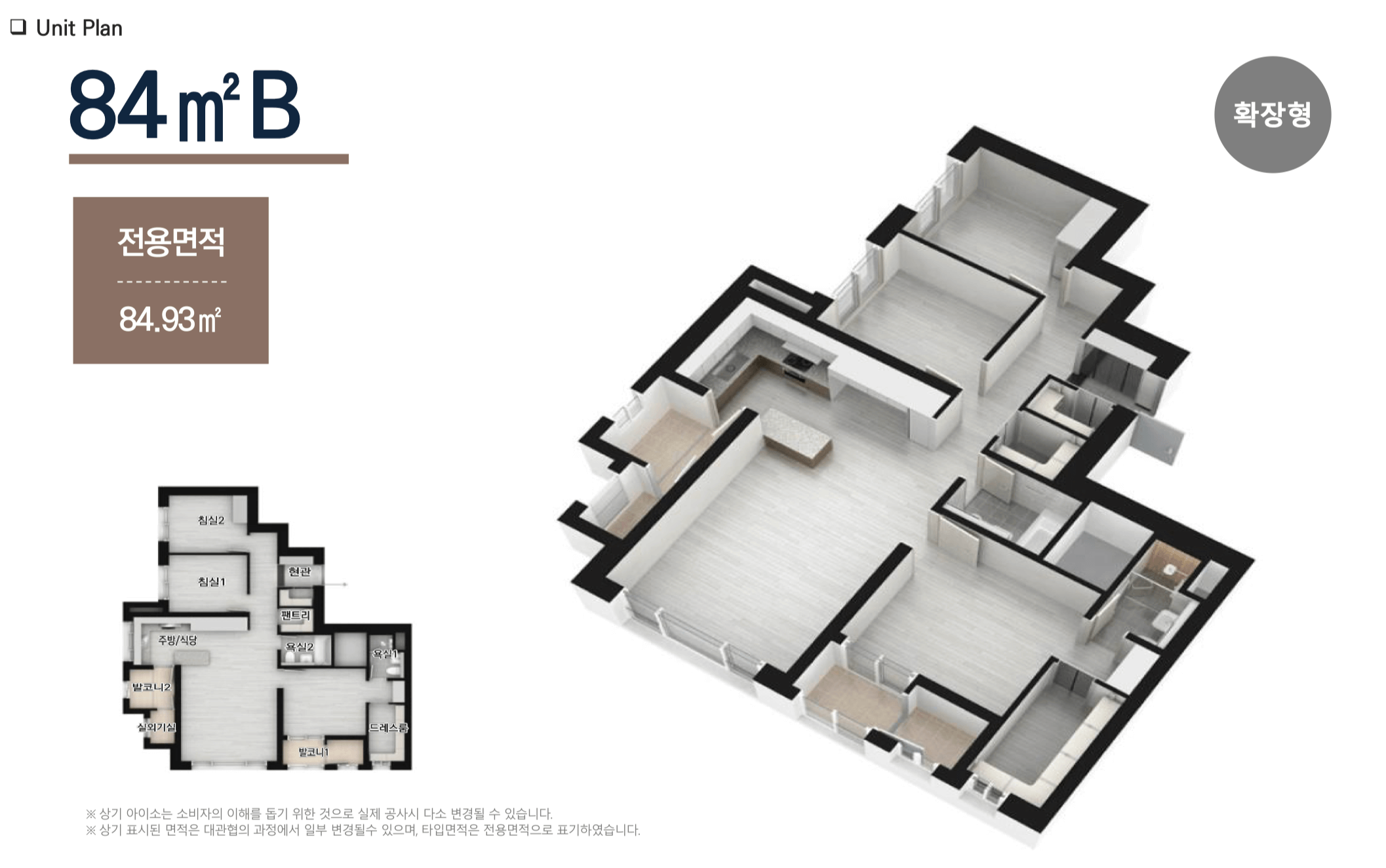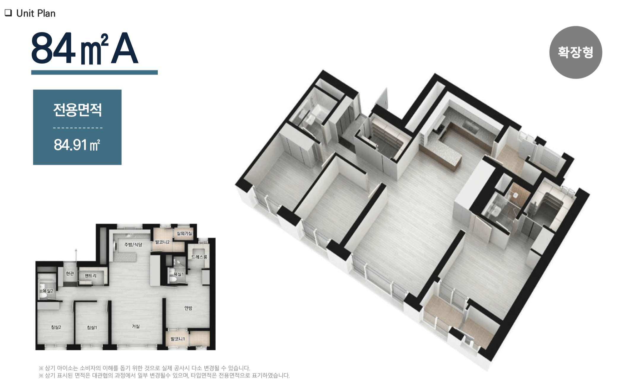 개별 유닛은 판상형 위주의 설계로 전 세대가 채광, 통풍에 유리하며, LDK(Living, Dining, Kitchen) 구조를 통해 탁 트인 거실과 주방의 일체감을 구현했습니다. ㄷ자형 주방은 광폭 키친창과 함께 개방감을 더해주며, 실내가 더욱 넓어 보이는 효과를 줍니다.
