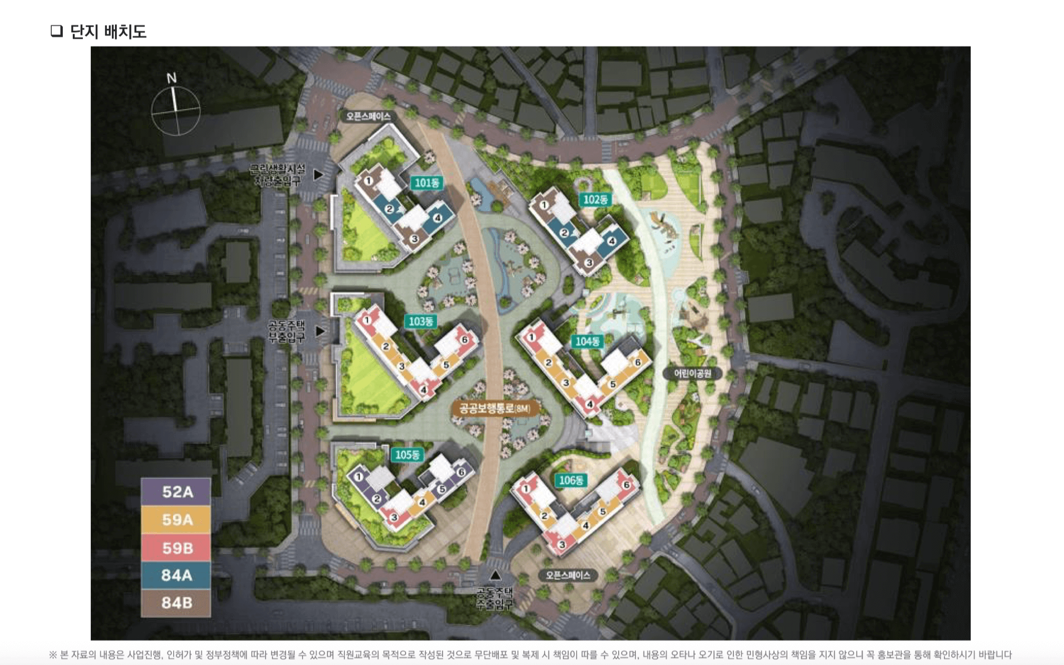 특히 주력 타입인 59㎡는 전체 공급 세대 중 784세대로 가장 많은 비중을 차지하며, 실용성과 공간 활용성이 뛰어난 4BAY 구조(59A형)를 채택해 채광, 통풍, 개방감을 모두 만족시킵니다.
