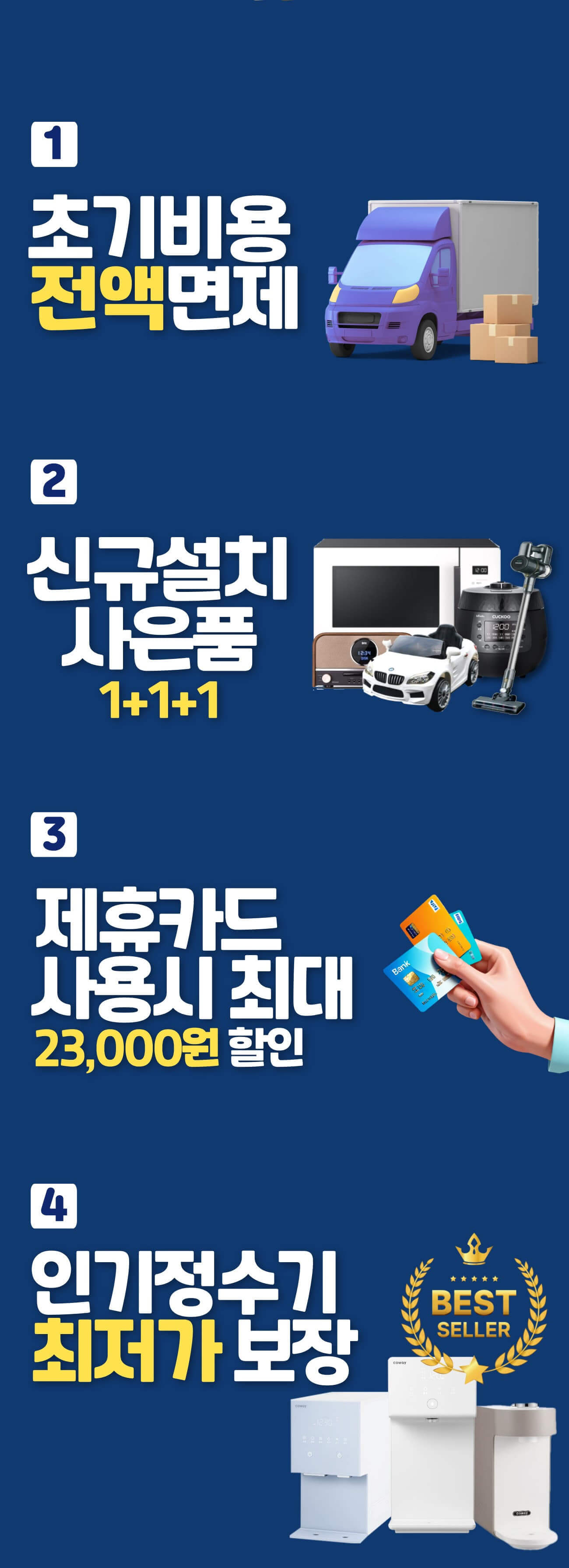 - 타사 전환 시 최대 15% 추가 할인: 타사 정수기에서 코웨이로 전환 시 추가 할인 혜택을 제공합니다.