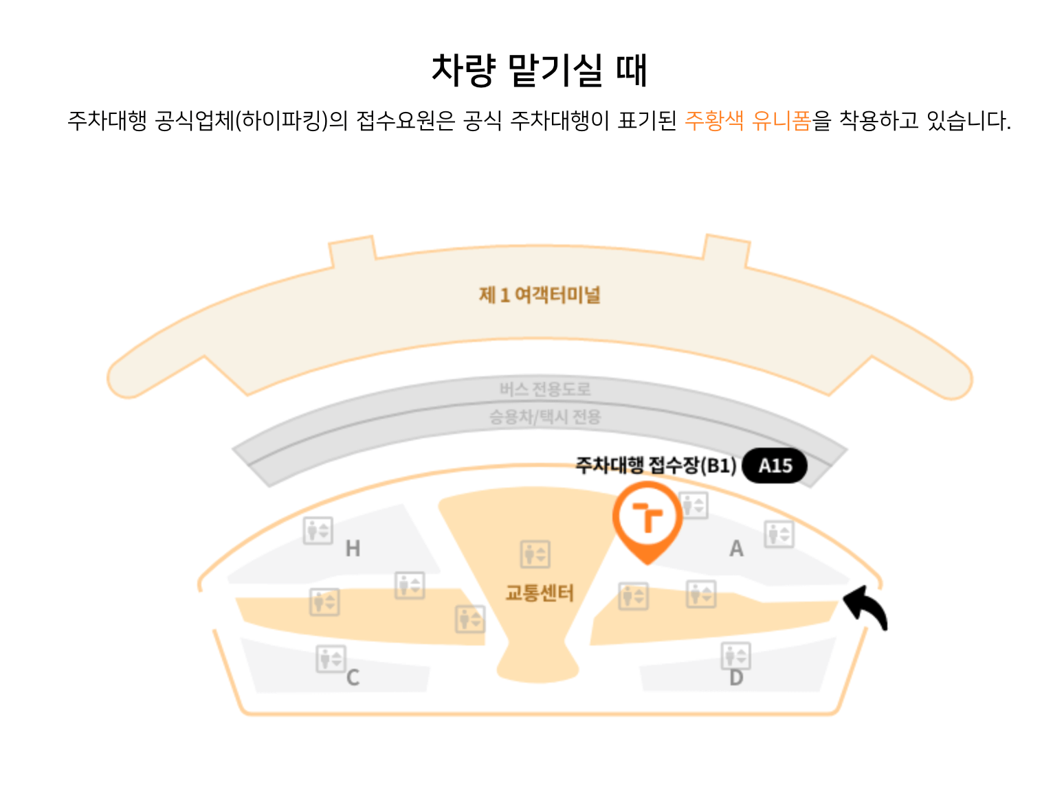 단기주차장 지하 1층 A15번 기둥 위치에서 접수요원을 만날 수 있습니다. 접수요원은 오렌지색 유니폼을 착용하고 있으니 참고하시기 바랍니다.