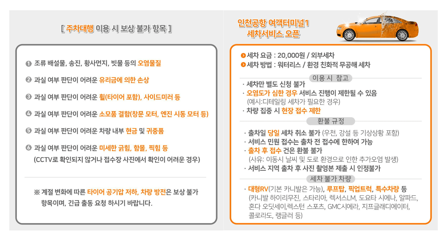 차량은 외곽 주차장(하늘정원 인근)에 보관되며, 실외 주차장의 특성상 우천, 강설 등의 외부 환경에 노출될 수 있습니다. 성수기에는 임시 주차장 또는 화물청사 주차장에 보관될 수 있으며, 차량 관리의 안전성을 위해 공식 업체를 이용하는 것이 중요합니다.