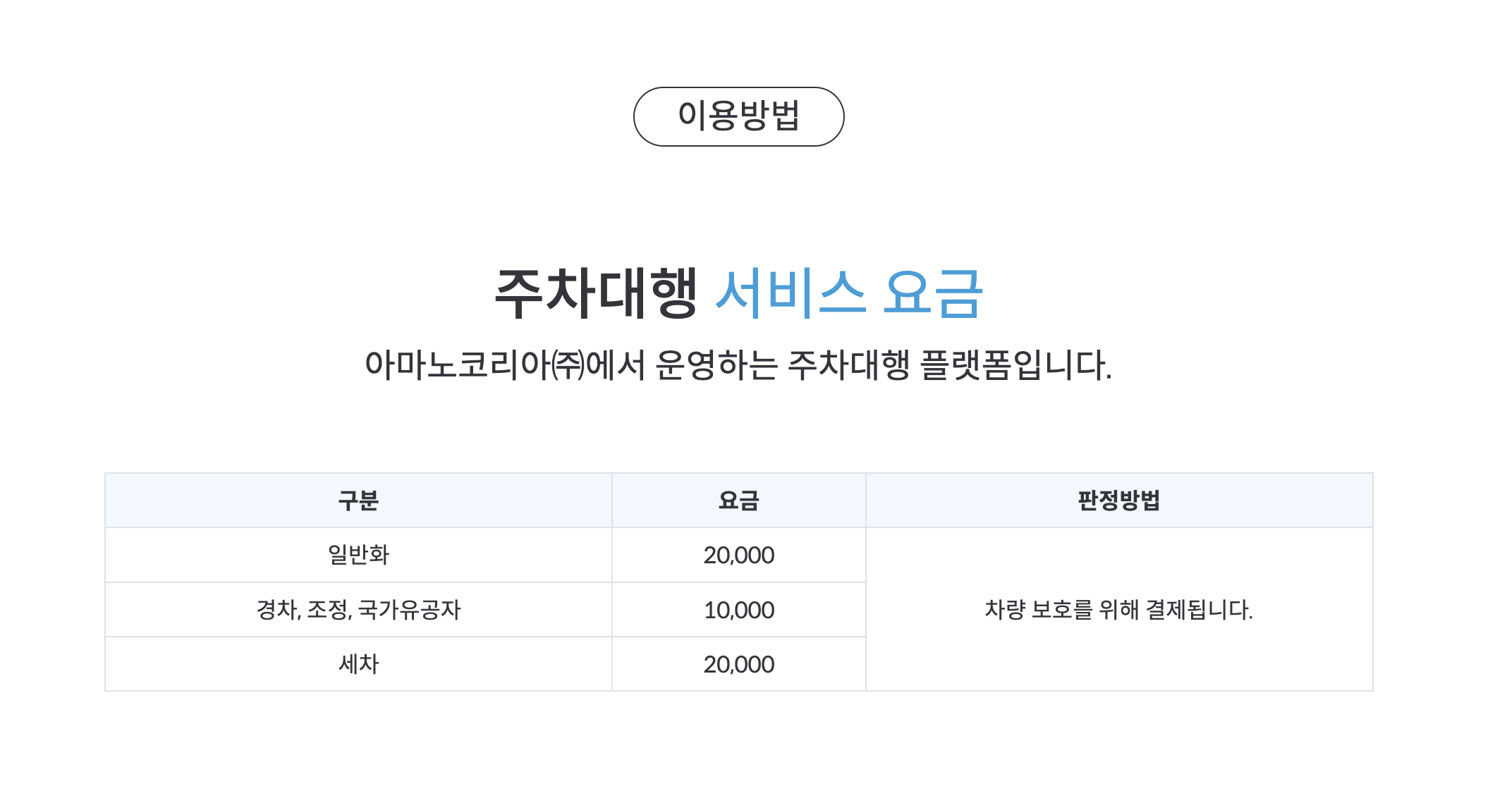 아마노코리아의 주차대행 서비스 요금은 일반 차량 20,000원, 경차·장애인·국가유공자 차량 10,000원입니다.