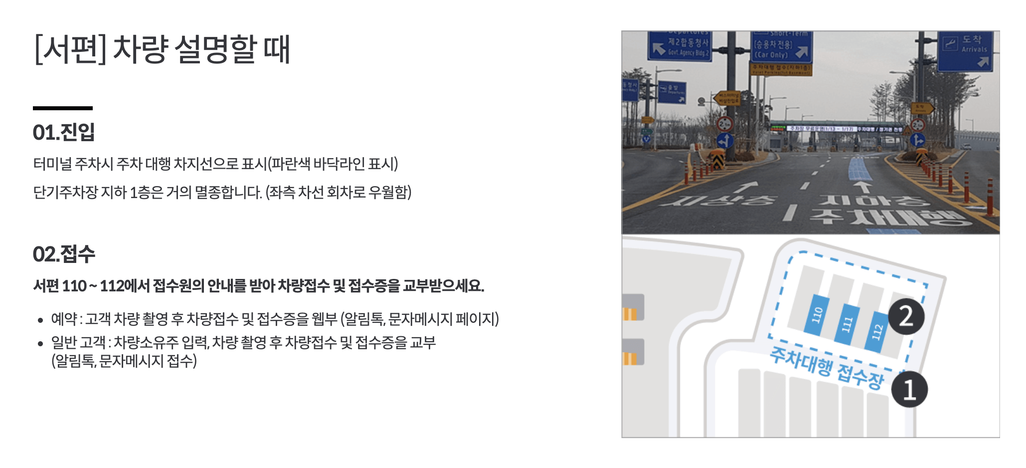 서편 110~112번 구역에서 접수원의 안내에 따라 차량을 인도합니다. 예약 고객의 경우 차량 촬영 후 모바일 접수증(문자 또는 알림톡)이 즉시 발송됩니다.
