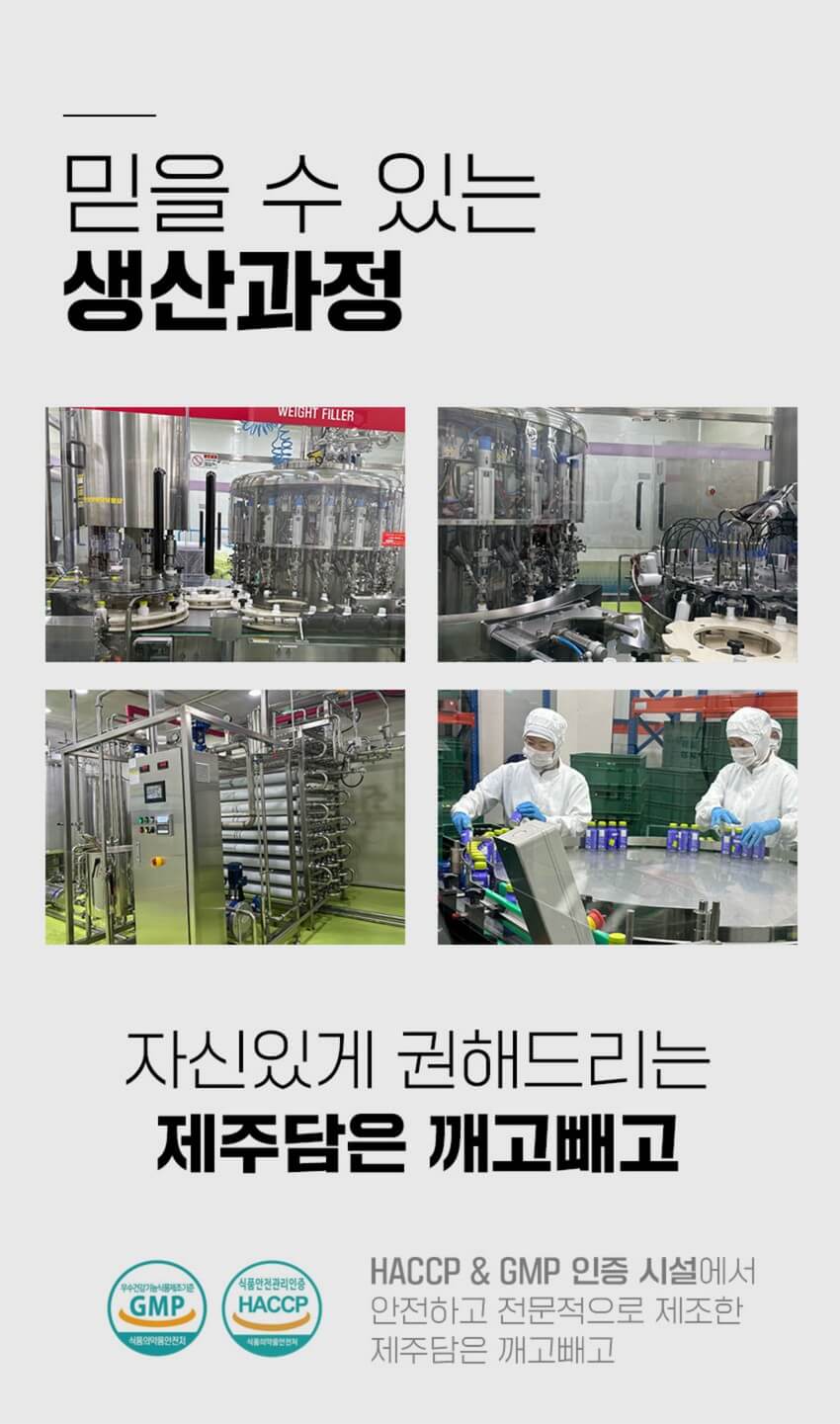 - HACCP & GMP 인증 시설에서 전문 제조: 제주담은 깨고빼고는 안전하게 제조된 제품으로 HACCP와 GMP 인증 시설에서 생산되었습니다. 이로써 제품의 품질과 안전성이 보장됩니다.