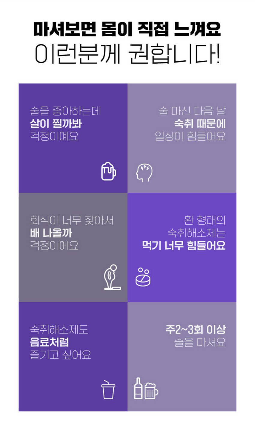 - 글루타치온을 넣어 항산화 효과 작용: 글루타치온은 강력한 항산화 성분으로 알려져 있으며, 숙취 해소에 도움을 줄 수 있습니다. 술 마신 후에 피로하고 지칠 때, 글루타치온은 몸을 회복시키는 데 도움을 줍니다.