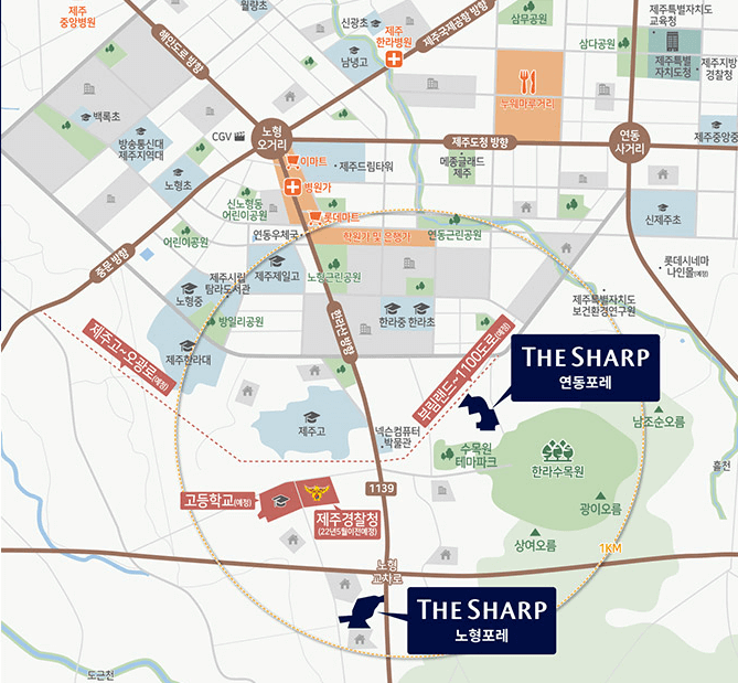 두 단지는 도심 생활권을 공유하고 있어 생활 인프라가 매우 풍부합니다. 이마트, 롯데마트 등 대형 쇼핑시설이 단지에서 차로 5분 거리 내에 위치하고 있으며, CGV, 뮤지엄 등의 문화시설도 인접해 있어 여가 생활을 편리하게 즐길 수 있습니다. 또한, 제주도청, 은행, 주민센터, 병원 등 공공 및 의료 시설들이 가까워 생활의 편리함을 제공합니다.