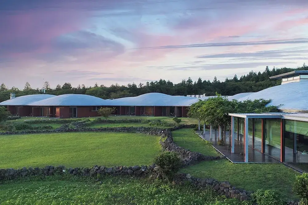 제주 포도호텔은 제주 화산석과 한옥의 전통미를 결합하여 설계된 독창적인 건축물이 특징입니다. 호텔의 곡선형 지붕은 제주도의 돌담을 연상시키며, 주변 자연과 완벽하게 어우러집니다. 건물 자체가 자연 속에 스며든 듯한 느낌을 주며, 투숙객들에게 편안하고 아늑한 분위기를 제공합니다.